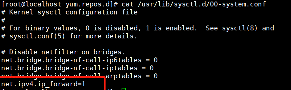 echo "net.ipv4.ip_forward=1" >>/usr/lib/sysctl.d/00-system.conf;添加完成之后查看一下;
