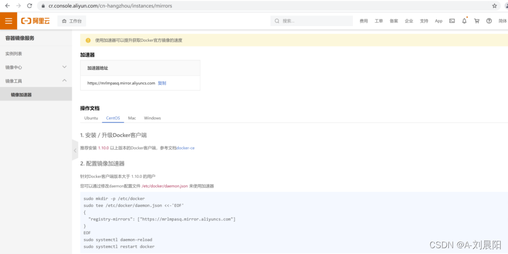 由于docker默认从docker hub(https://registry.hub.docker.com/)下载镜像,所以速度非常慢,可以通过阿里云的镜像加速器提高镜像拉取的速度。