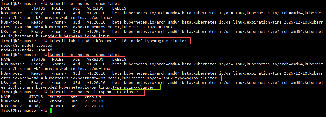kubectl label nodes k8s-node1 k8s-node2 type=nginx-cluster- 确认标签是否生效