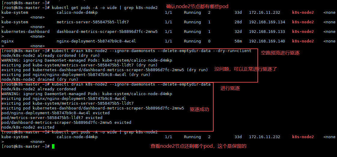 kubectl get pods -A --field-selector spec.nodeName=k8s-node2- 在驱逐之前可以先空跑预览一下,不真正执行,确认没问题再进行驱逐,避免出问题