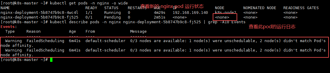 # 因为我们配置的是node2节点,而node2已经做了节点隔离,所以不可调度,那么新的pod就起不来了。