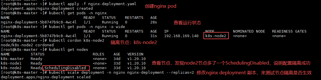kubectl cordon k8s-node2# 创建k8s-node2节点隔离kubectl get nodes# 查看node节点状态,会出现一个SchedulingDisabled,说明节点隔离设置成功。