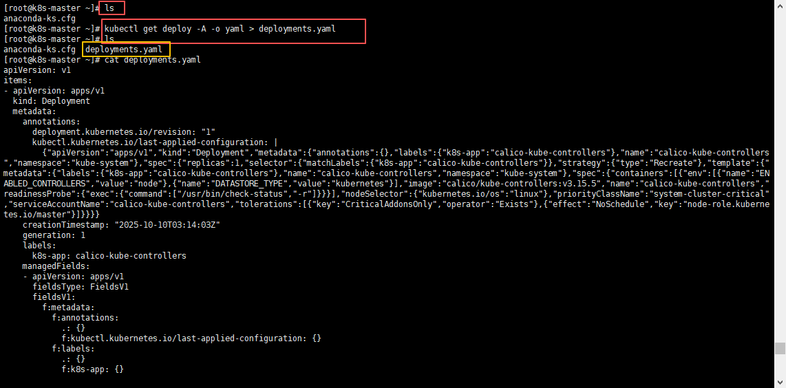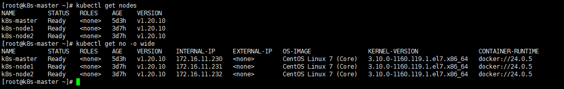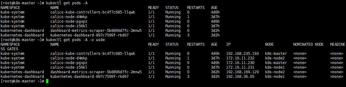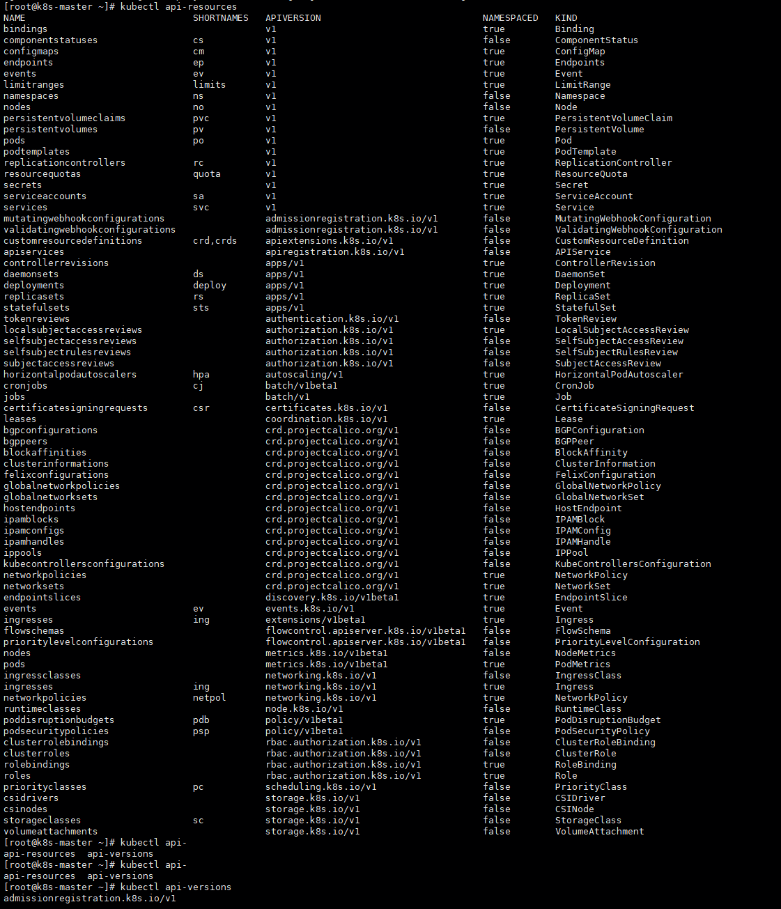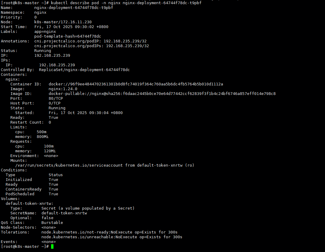 kubectl get <资源类型> [-n 命名空间] [<资源名>]-o wide:查看资源详细信息,例如此pod运行再哪台机器,nodes查看操作系统、内核版本等;-o yaml|json整份对象定义,用于备份、比对等;-n:指定命名空间namespace;-w:持续监控输出,用于创建pod之后持续查看状态是否正常,或node的健康状态;-A:查看所有