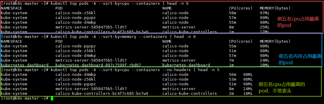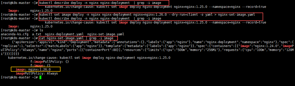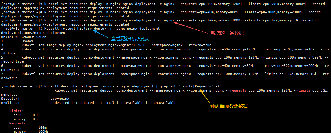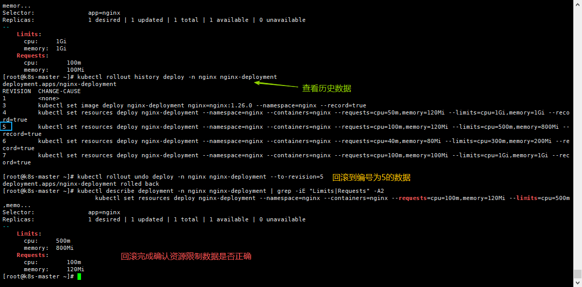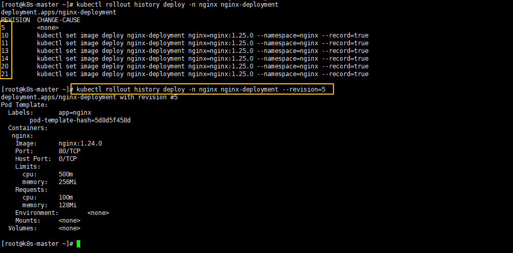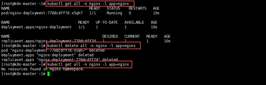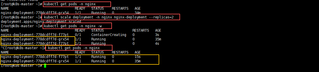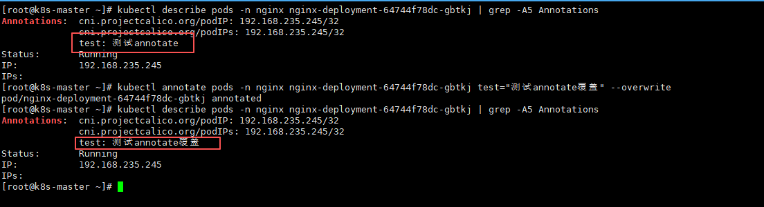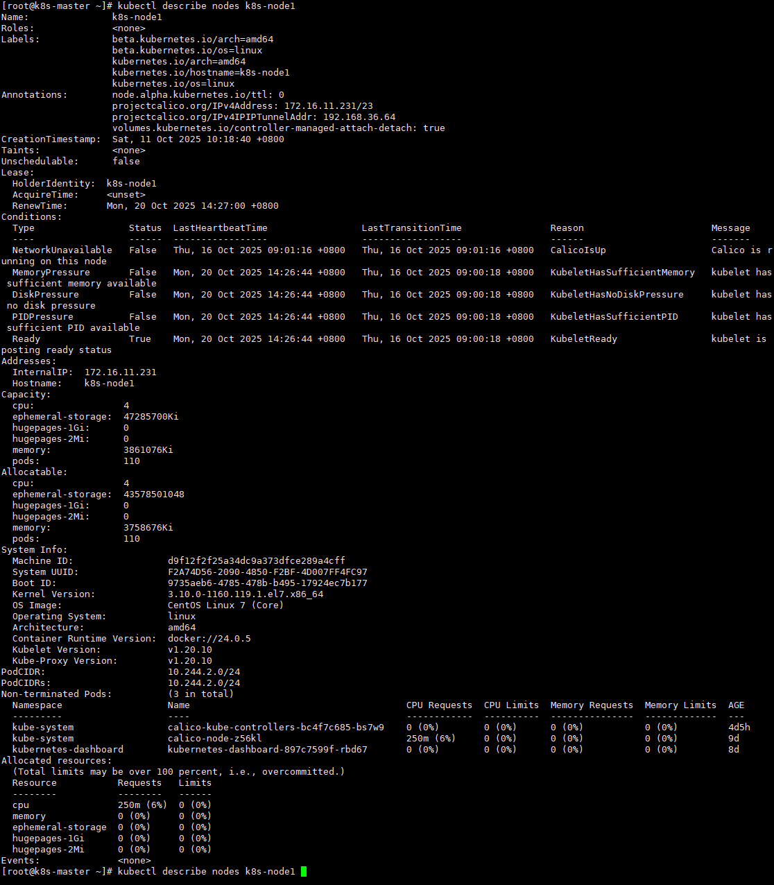 kubectl get <资源类型> [-n 命名空间] [<资源名>]-o wide:查看资源详细信息,例如此pod运行再哪台机器,nodes查看操作系统、内核版本等;-o yaml|json整份对象定义,用于备份、比对等;-n:指定命名空间namespace;-w:持续监控输出,用于创建pod之后持续查看状态是否正常,或node的健康状态;-A:查看所有
