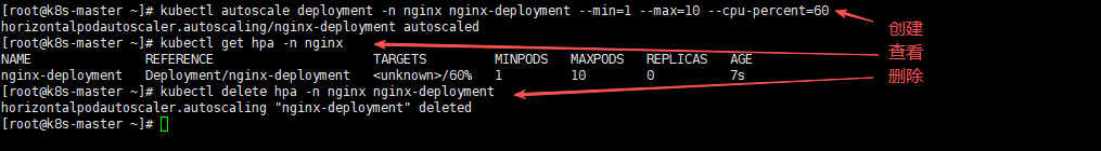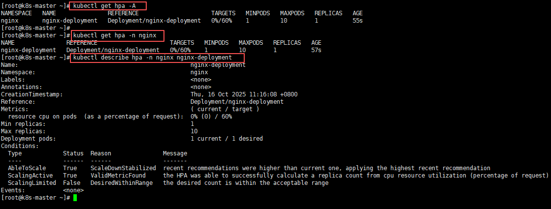 horizontalpodautoscalers / hpa | 看 HPA 当前/目标 CPU、副本数 | kubectl get hpa -A |