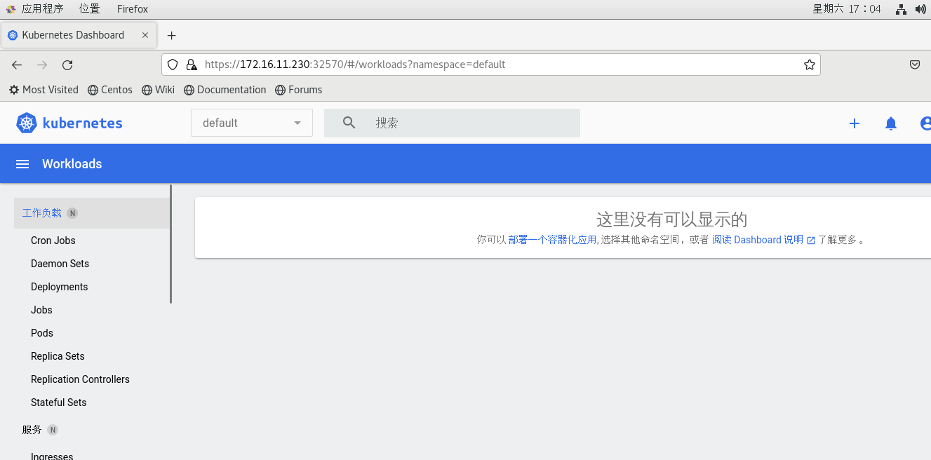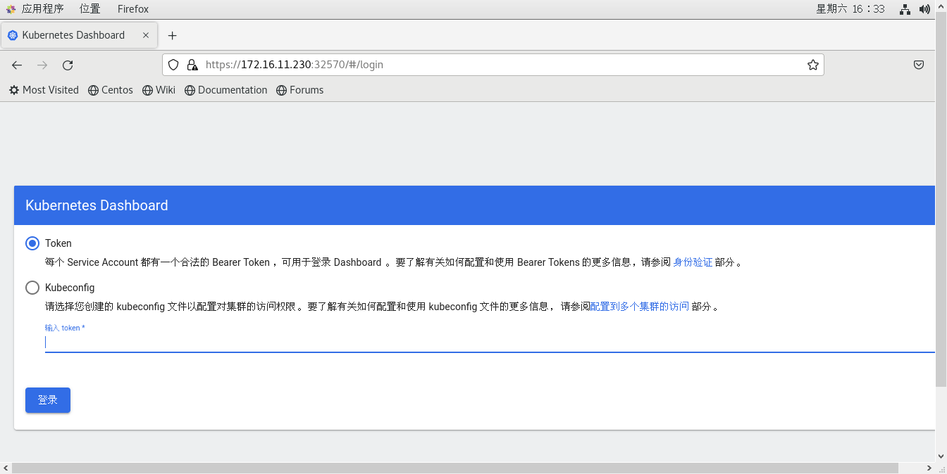 kubernetes-dashboard NodePort 10.0.0.152 <none> 443:32570/TCP 25m修改完之后再次查看service就会看到类型已经变成了NodePort,而且端口也多出来了一个,后面就是对外访问的服务端口,我们可以通过:节点IP:32570去访问到dashboard页面服务了;dashboard需要使用https访问,自带的证书在最新的chrome、edge浏览器中不受信,且界面无法手动进行确认继续。使用firefox访问可以在界面操作确认继续。