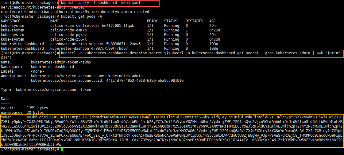 [root@k8s-master packages]# kubectl -n kubernetes-dashboard describe secret $(kubectl -n kubernetes-dashboard get secret | grep kubernetes-admin | awk '{print $1}')