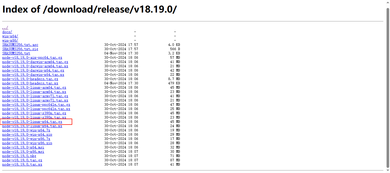 nodejs官网下载地址(v18.19.0直达):https://nodejs.org/download/release/v18.19.0/