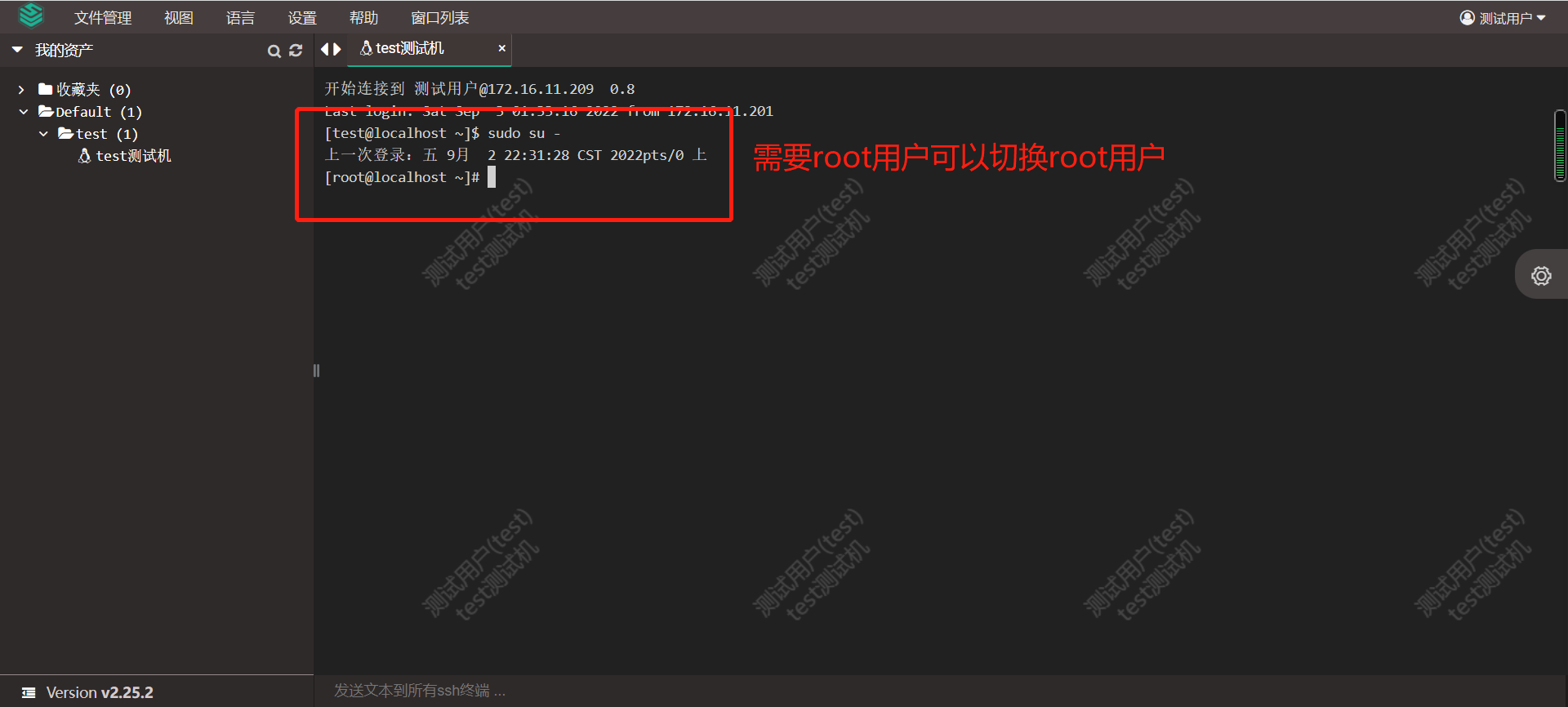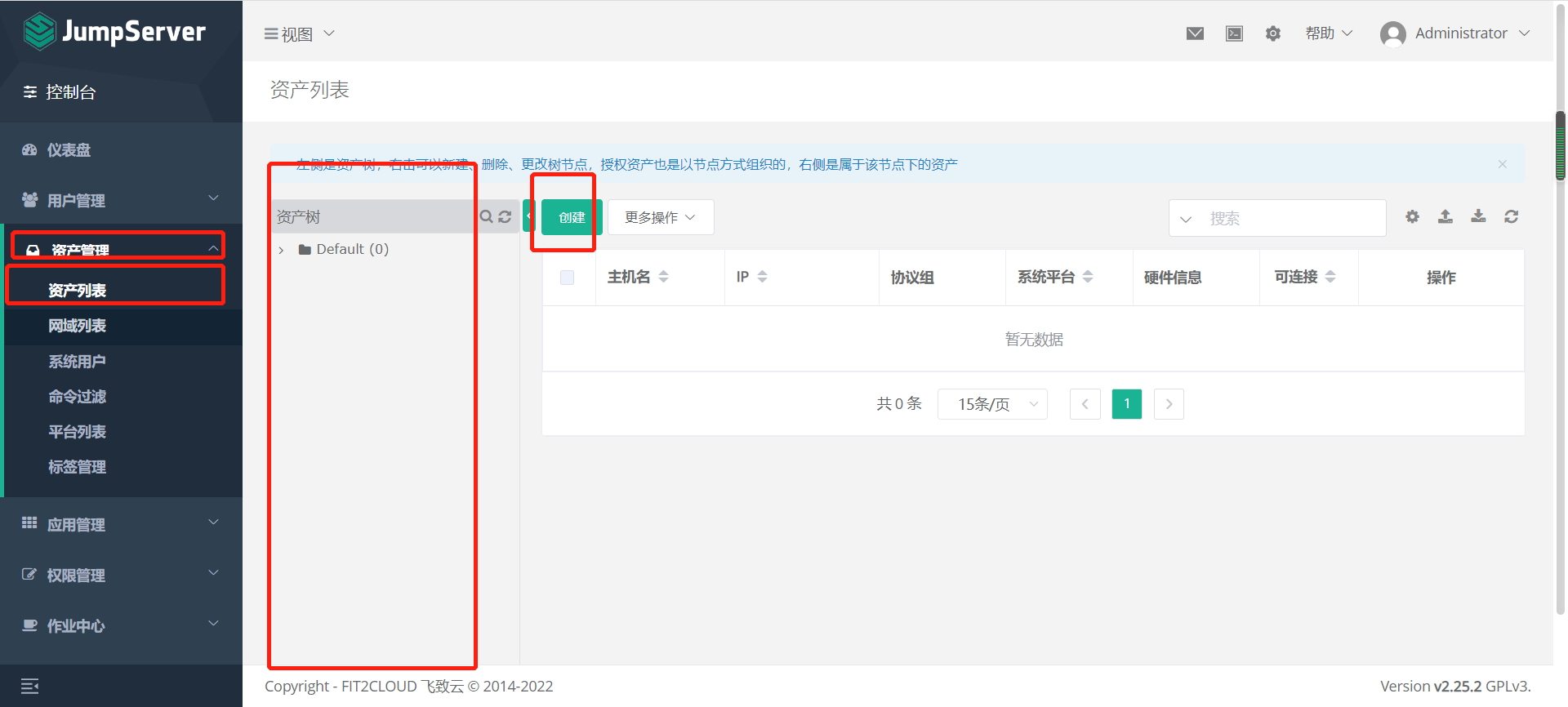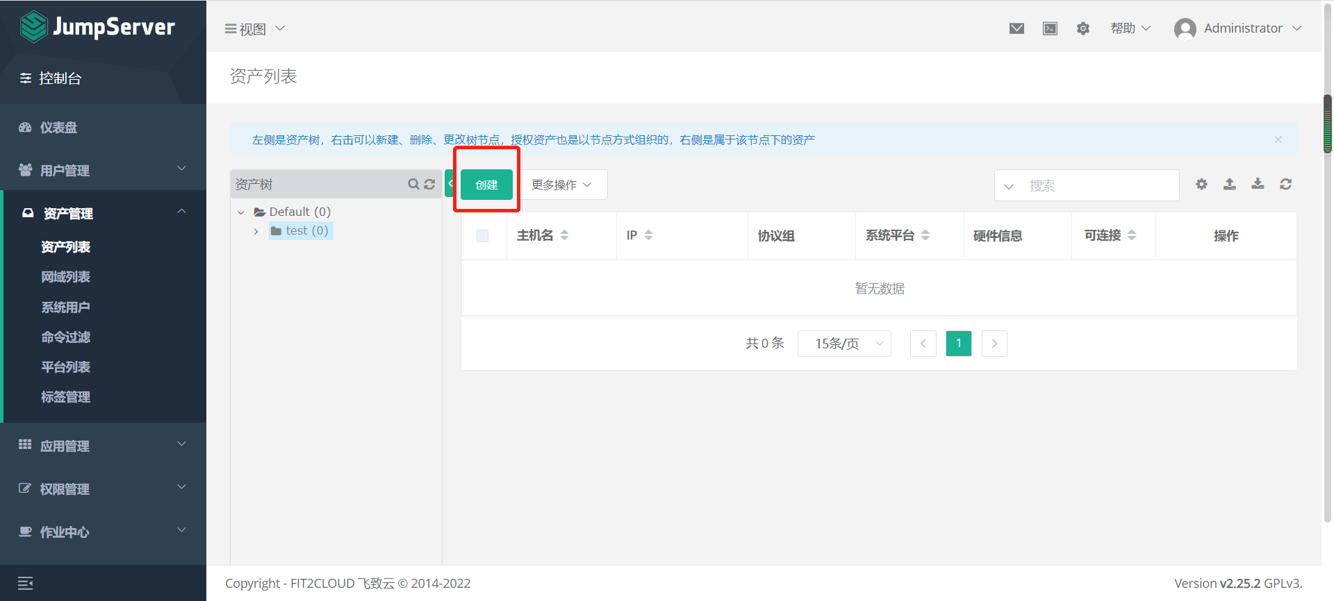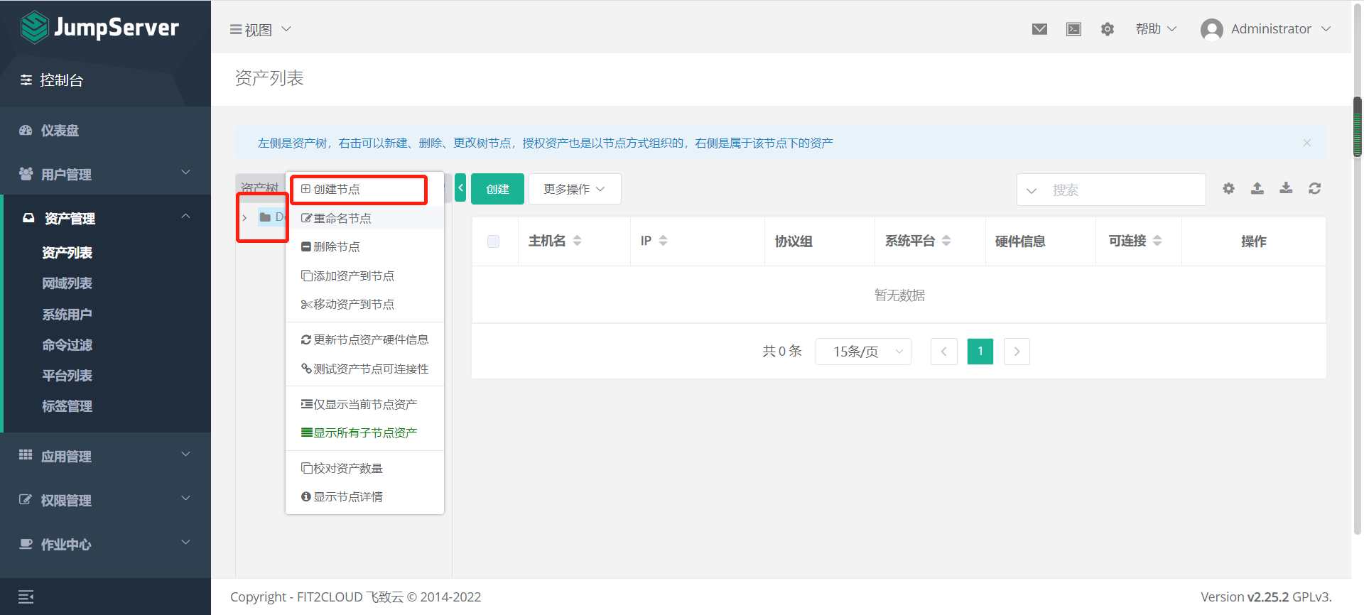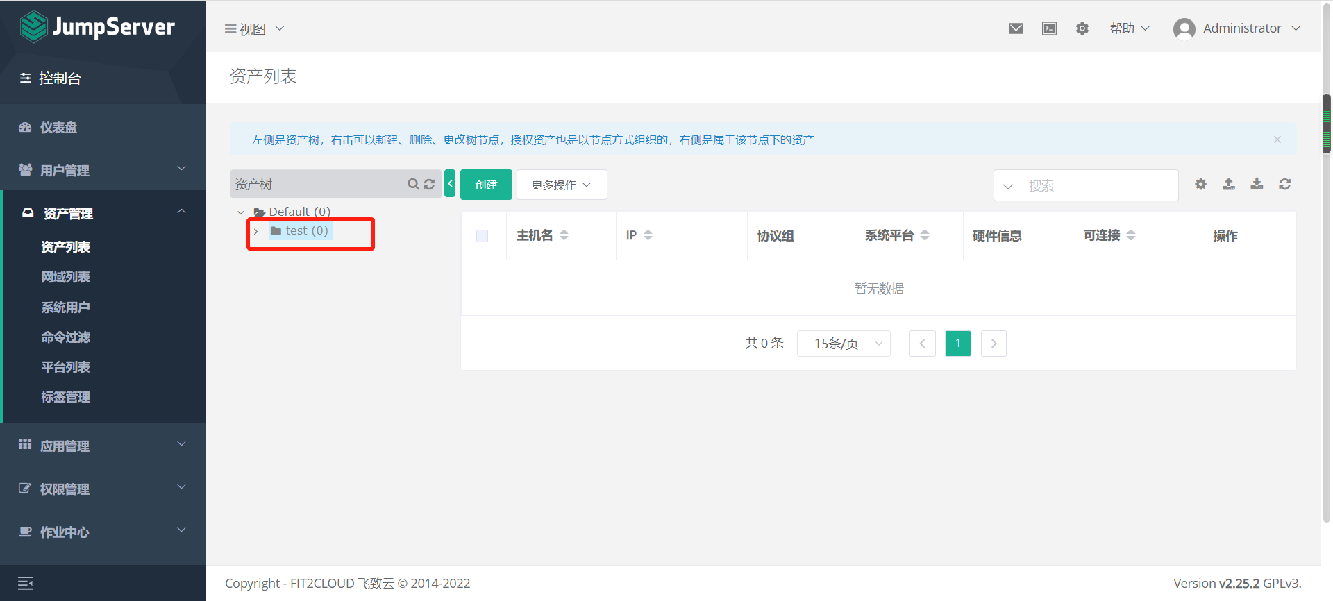右击资产树的default可创建节点、重命名节点、删除节点、添加资产到某个节点中、测试资产的可连接性......
