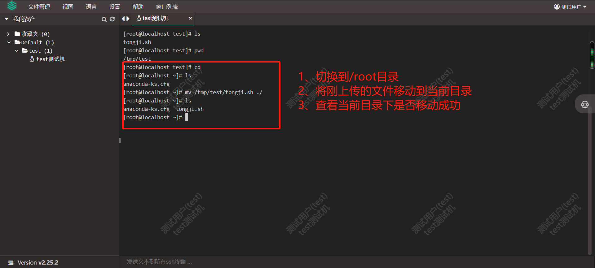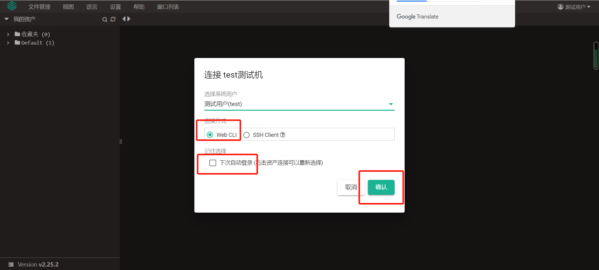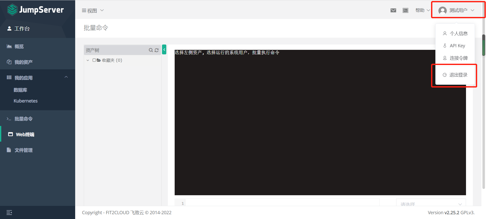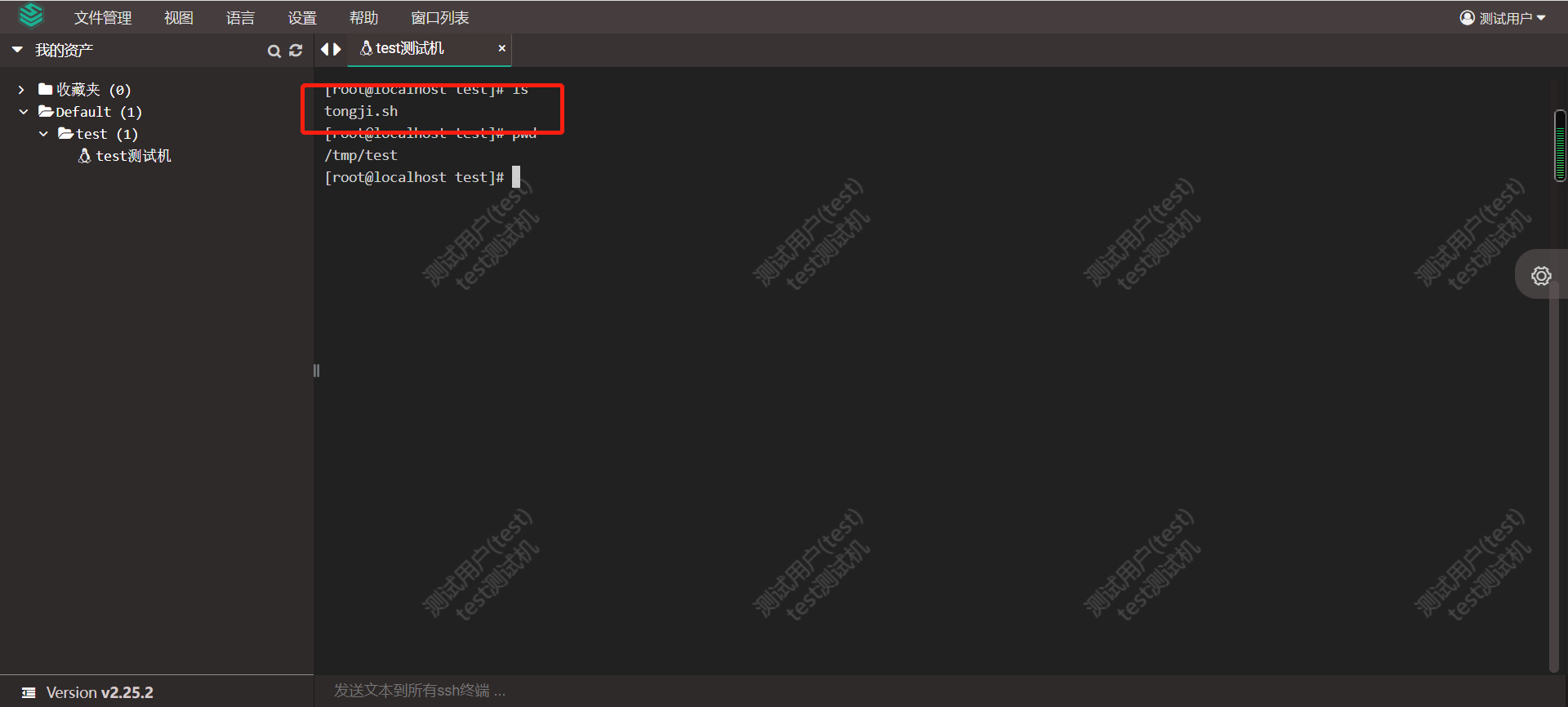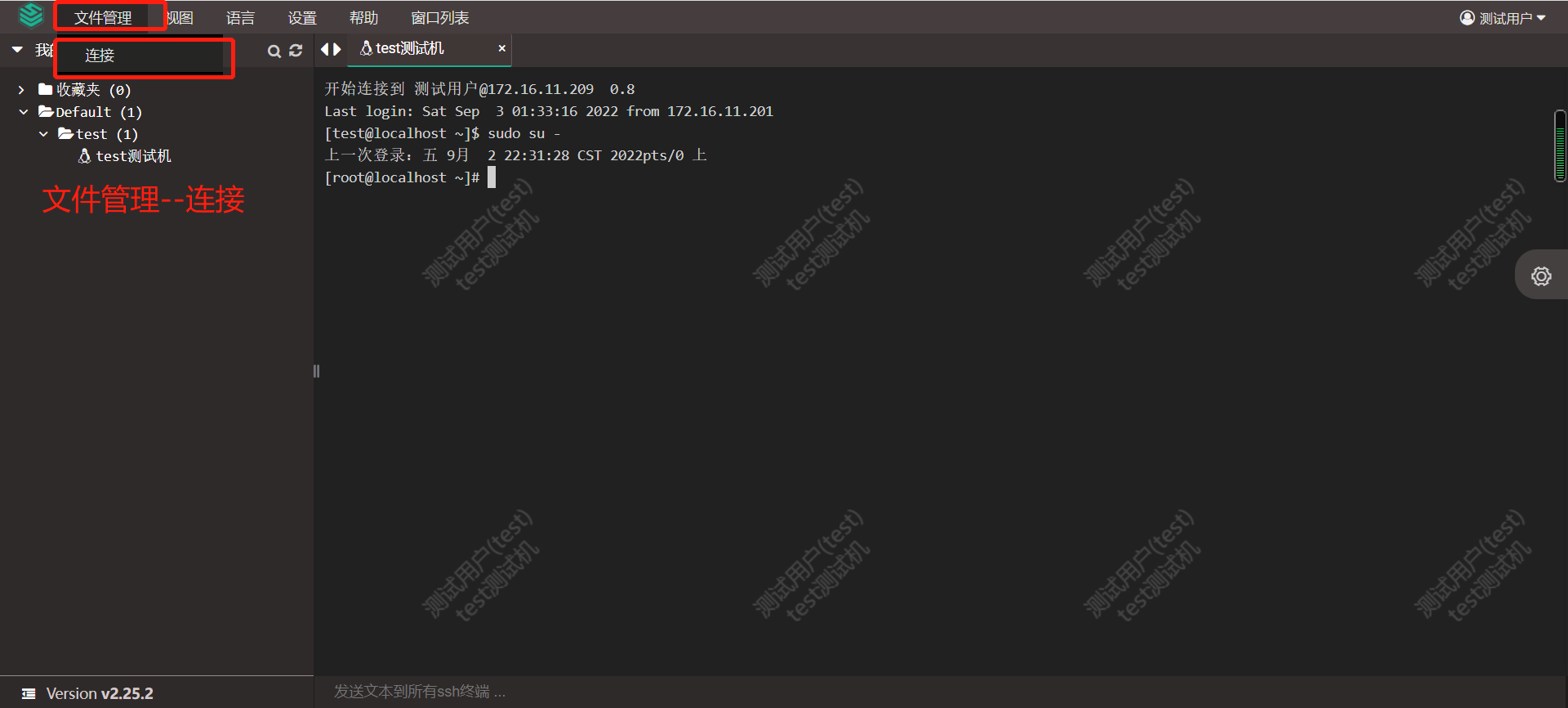 右击资产树的default可创建节点、重命名节点、删除节点、添加资产到某个节点中、测试资产的可连接性......