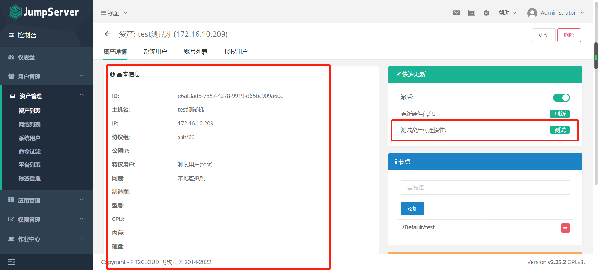 添加完资产之后可查看资产的详细信息,同时也可测试一下改资产是否连接上了服务器;