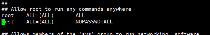 #进入visudo,找到放root权限的地方,也就是第100行,添加test