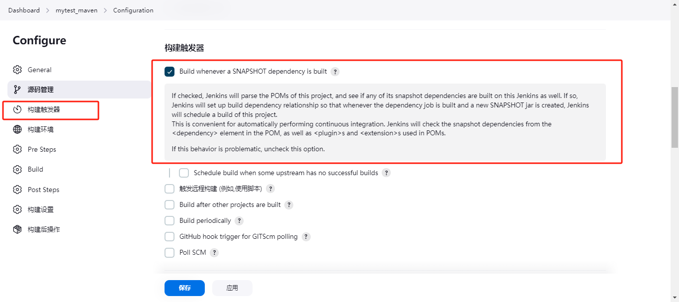 默认勾选上的是下面的选项:Jenkins将会去寻找之前已经构建过的pom依赖(如果有之前构建过的相同的pom文件),直接使用之前的镜像,便不会再去重新的解析了