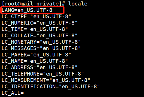 locale下面 LANG=en_US.UTF-8 是当前语言,属于英文;