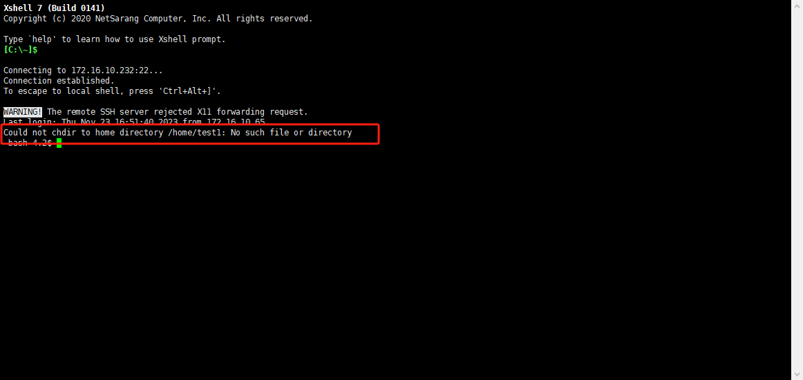 可以看到是没有的,那么可以判定是被误删或者是移动到其他地方了,导致ssh使用普通用户连接找不到家目录,才会报错。