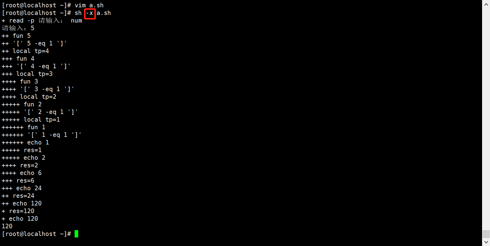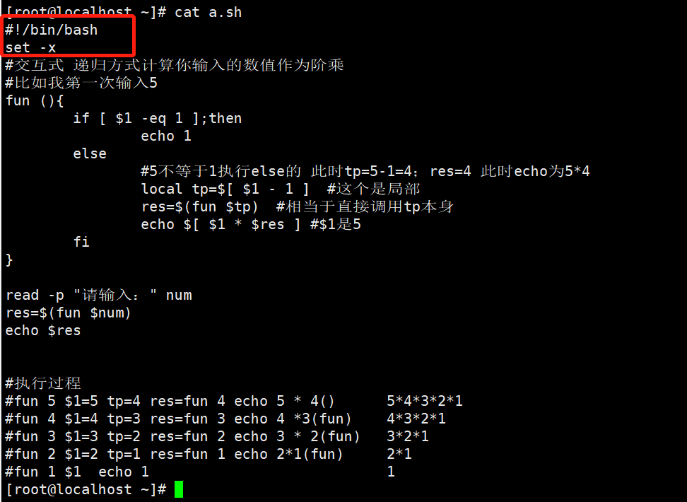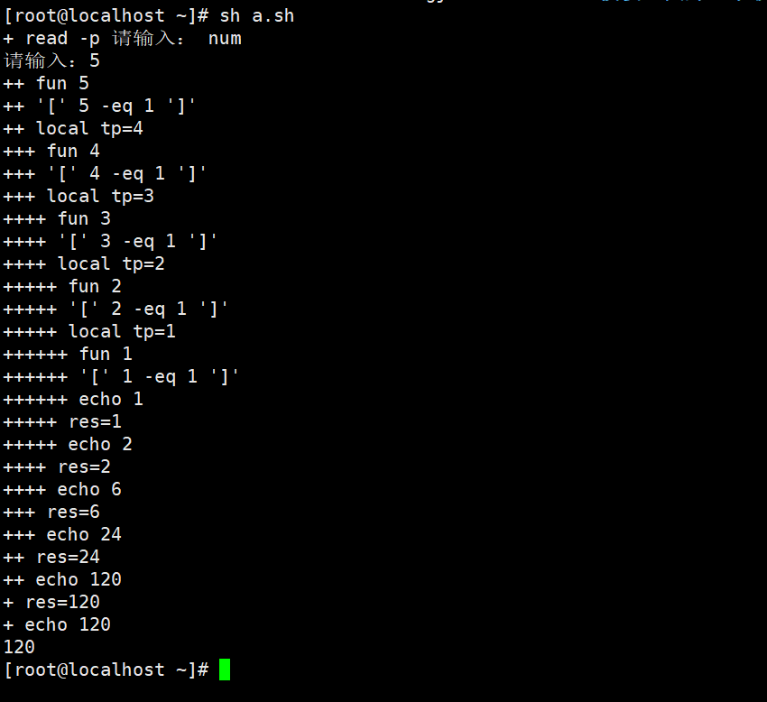 #fun 5 $1=5 tp=4 res=fun 4 echo 5 * 4() 5*4*3*2*1