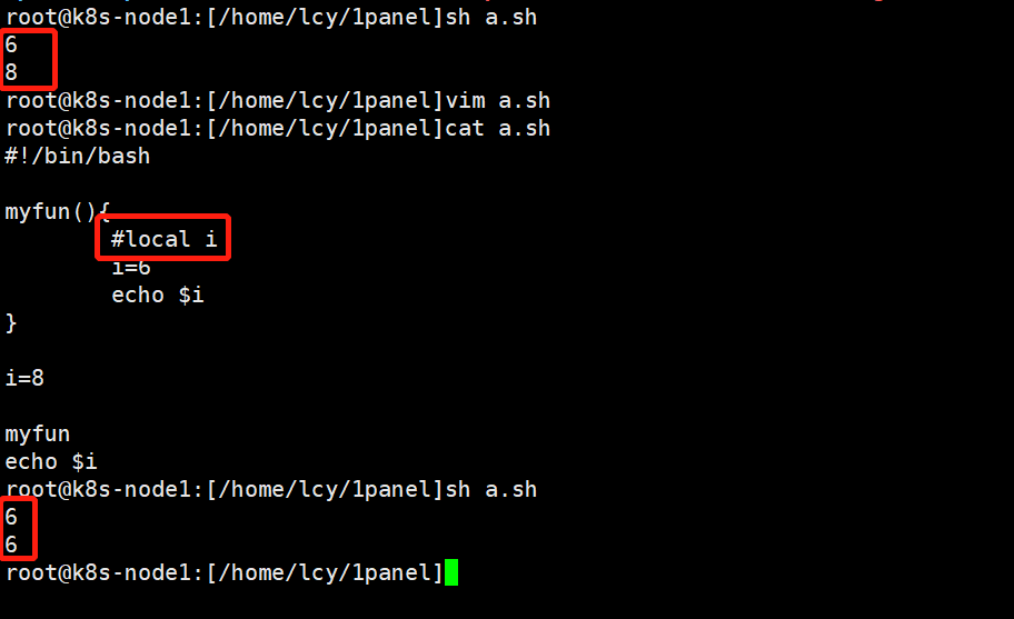 3.1函数内部变量通过local来实现 3.2通过定义myfun函数,在其内部设置局部变量i 3.3函数内部和外部分别赋值,进行结果验证。ps: