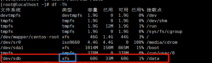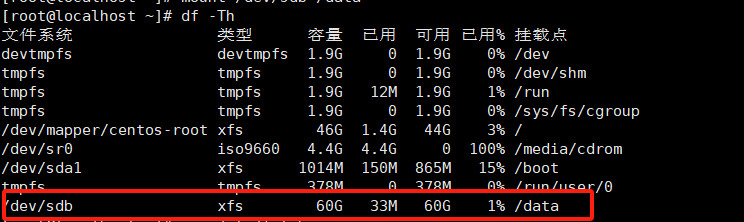 [root@localhost ~]# mount /dev/sdb /data