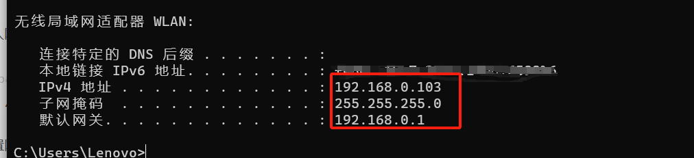 cmd打开输入ipconfig查看本机ip