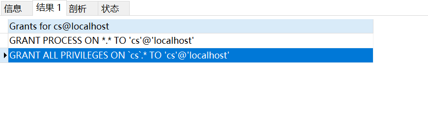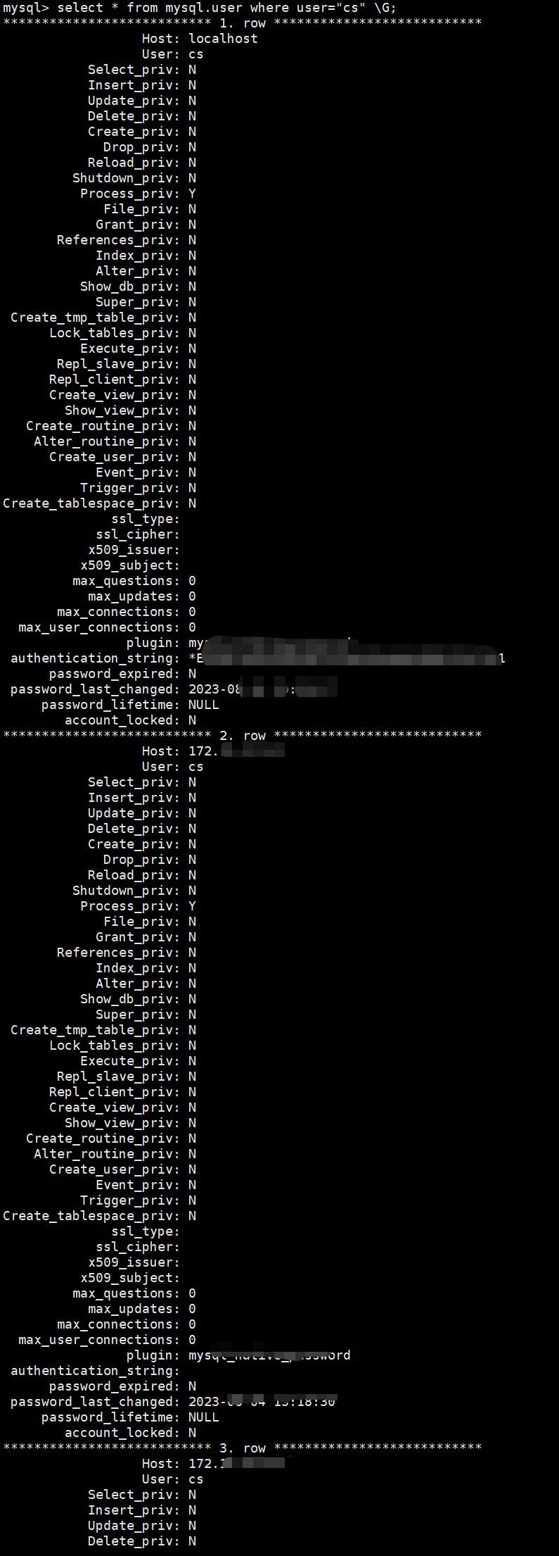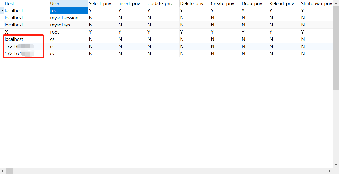 - 然后看mysql/user表,可以看到多了一个好几个cs用户,但是host不一样,也就是可以访问的ip主机不一样,只有上面显示的这几个访问数据库,然后测试登陆;