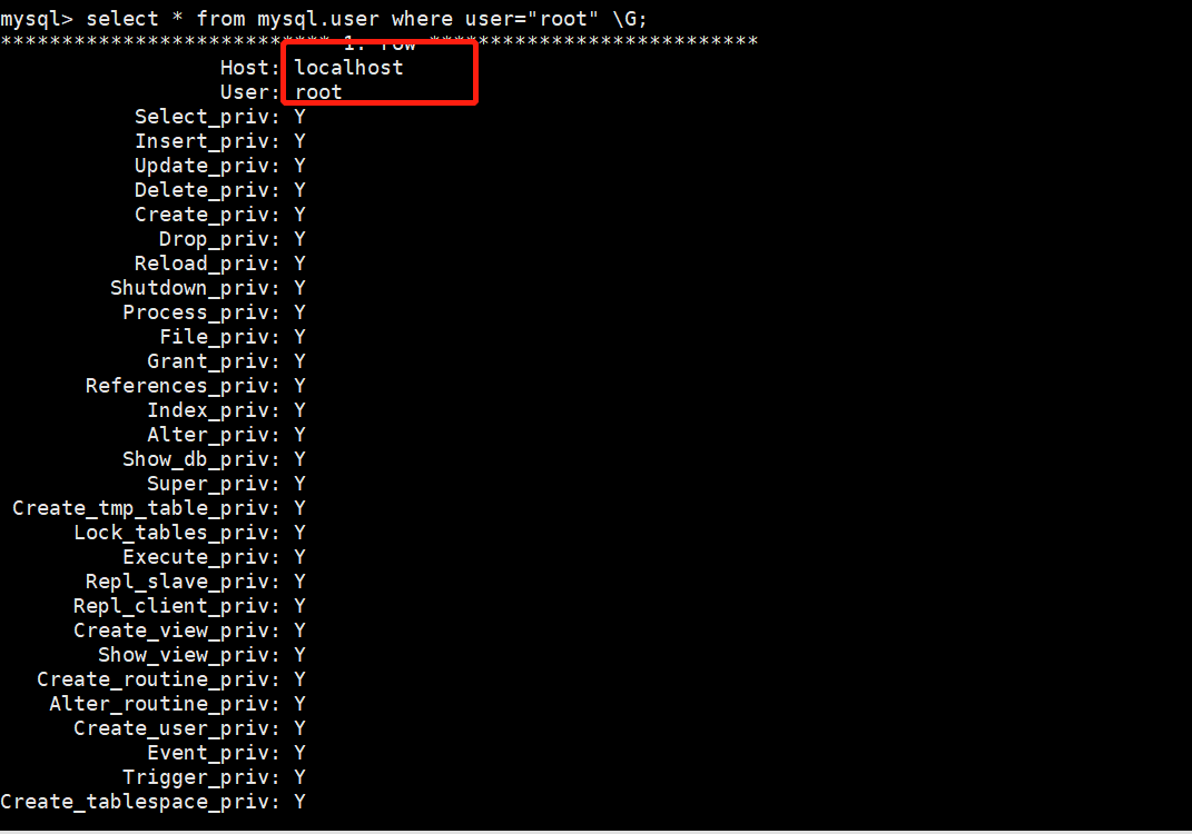 select * from mysql.user where user="root" \G;可以看到只剩一个root@localhost了,那么就成功禁用的root远程登陆;