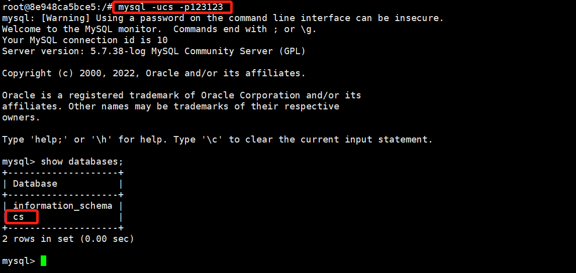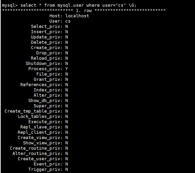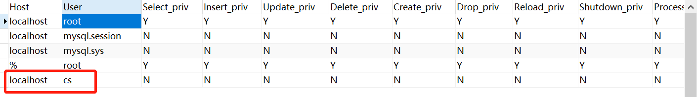 - 然后看mysql/user表,可以看到多了一个cs用户,只可以本地访问数据库,然后测试登陆;