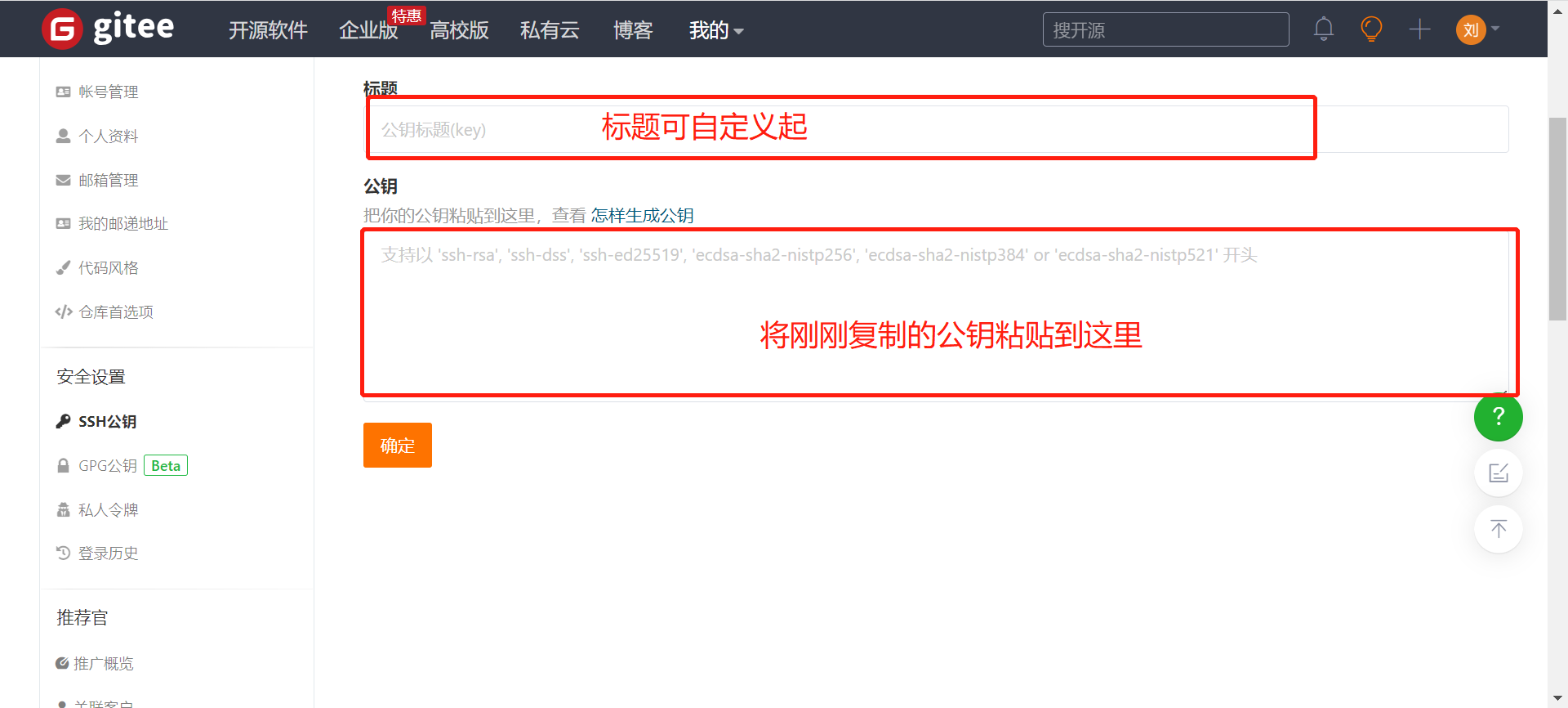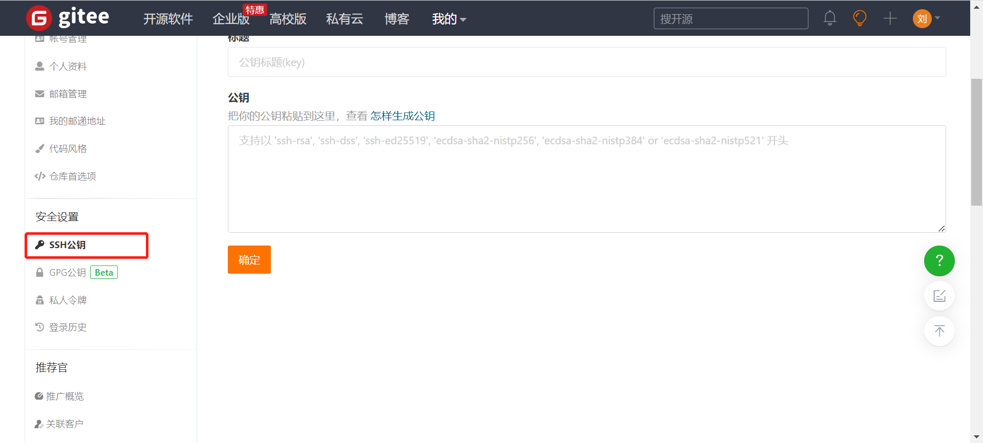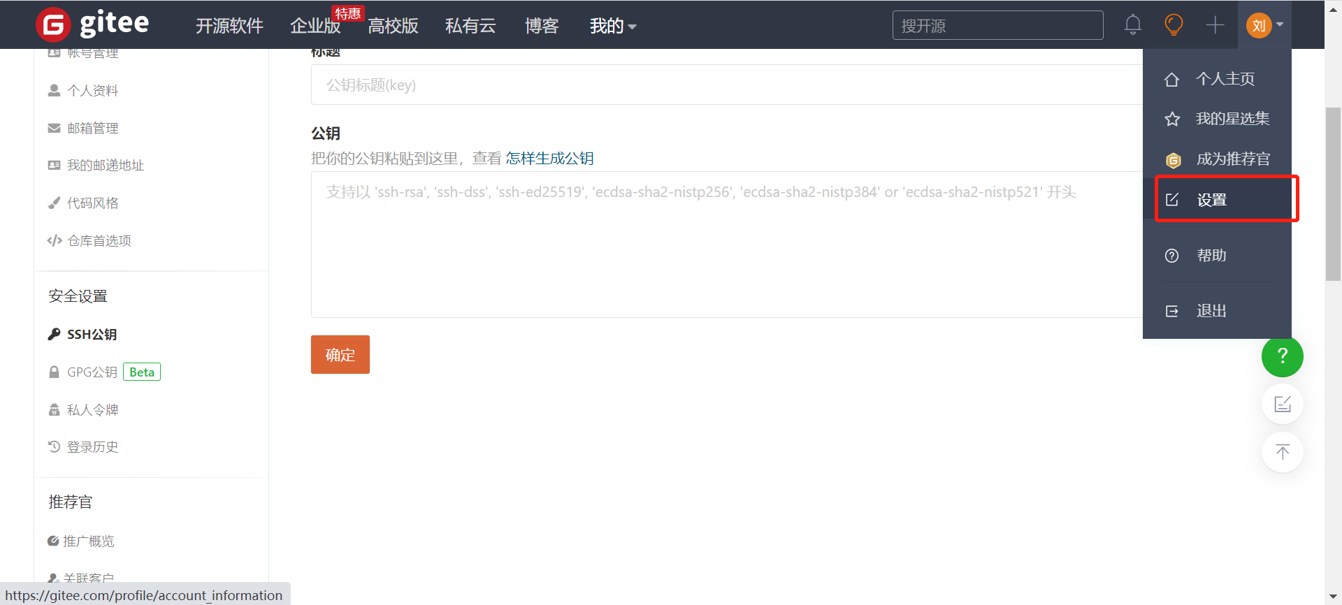 打开自己的Gitee的设置–>ssh公钥:https://gitee.com/profile/sshkeys