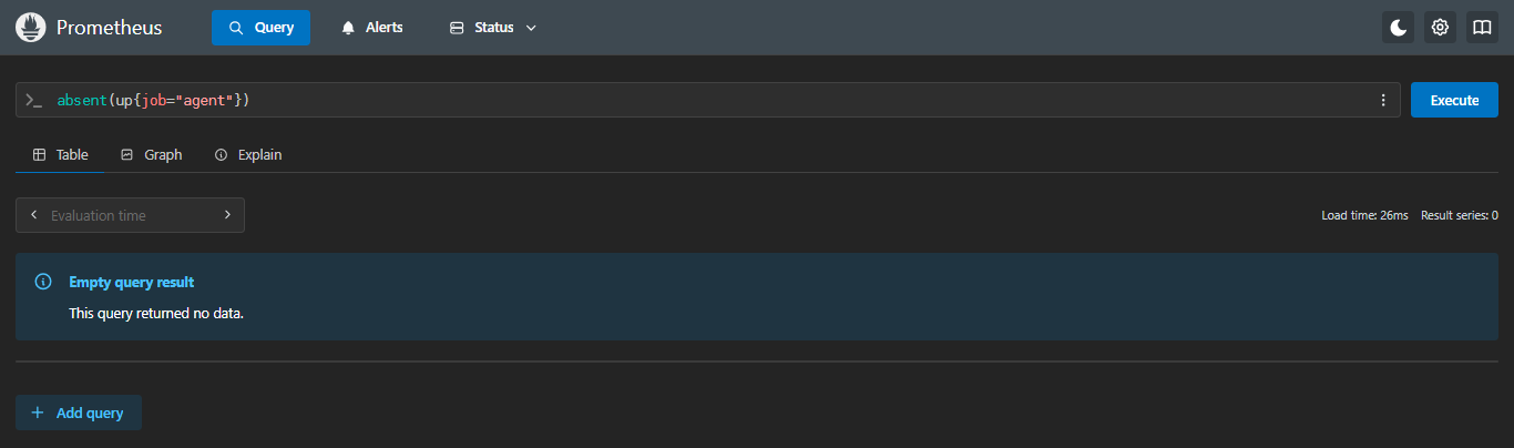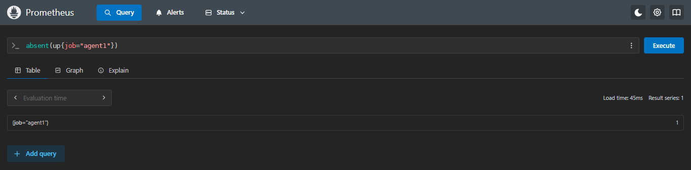 absent_over_time(this_metric_does_not_exist[5m])因为这个指标是随便打的,所以分钟内都是不存在的,也就会返回1;