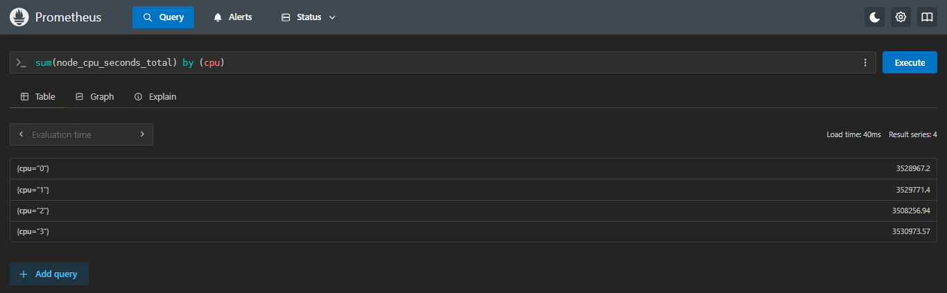 sum(node_cpu_seconds_total) by (cpu)这个查询会按