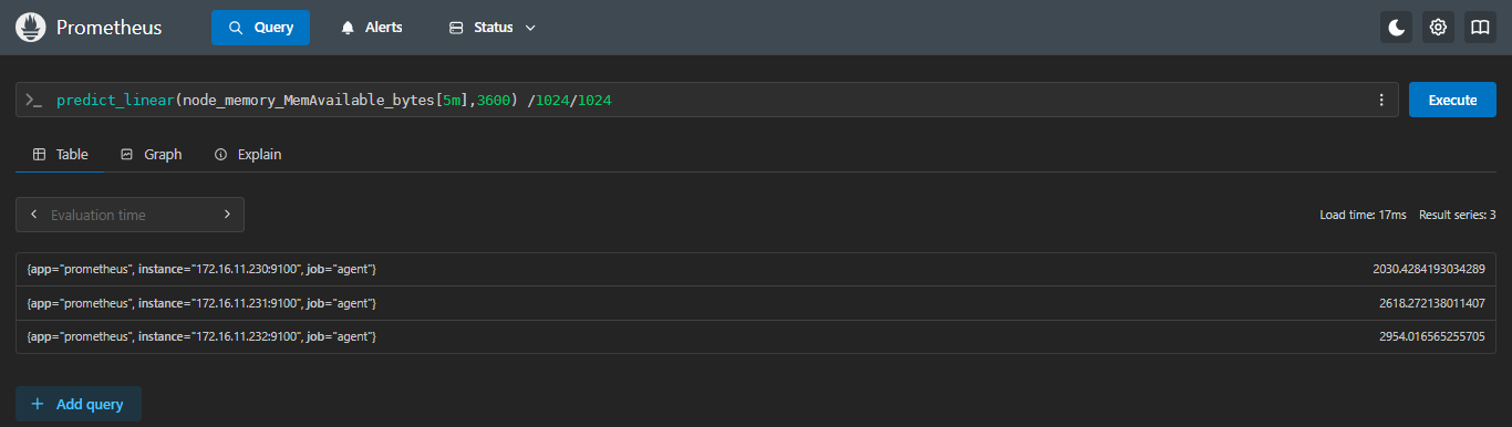 predict_linear(<指标名>[<范围>], <秒数>)- 示例:推测内存在一小时后能达到多少M
