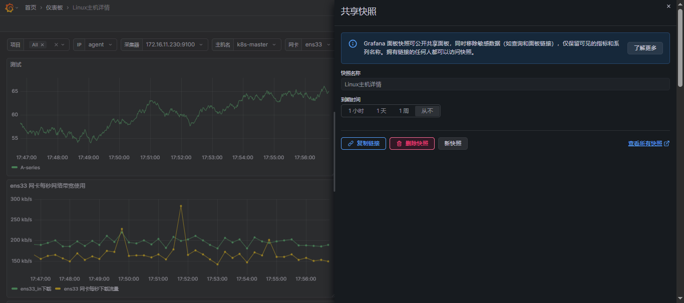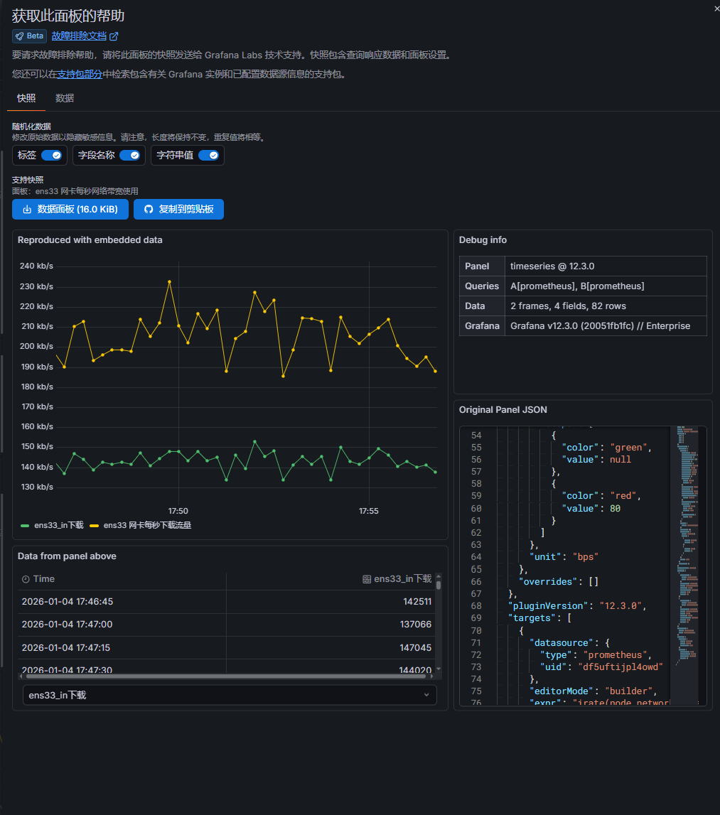 把当前面板查询的原始数据、面板 JSON、时间区间等一次性打包,生成一个脱敏快照(Snapshot)。