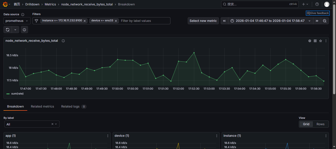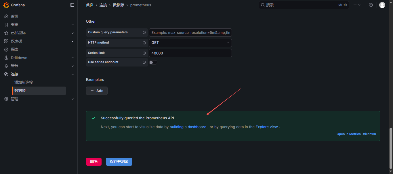 Open in Grafana Metrics” 是一个功能,主要用于快速跳转到与当前指标相关的详细分析页面,帮助用户更深入地查看和分析特定指标的详细数据。这个功能通常与 Prometheus、Loki 等数据源集成;