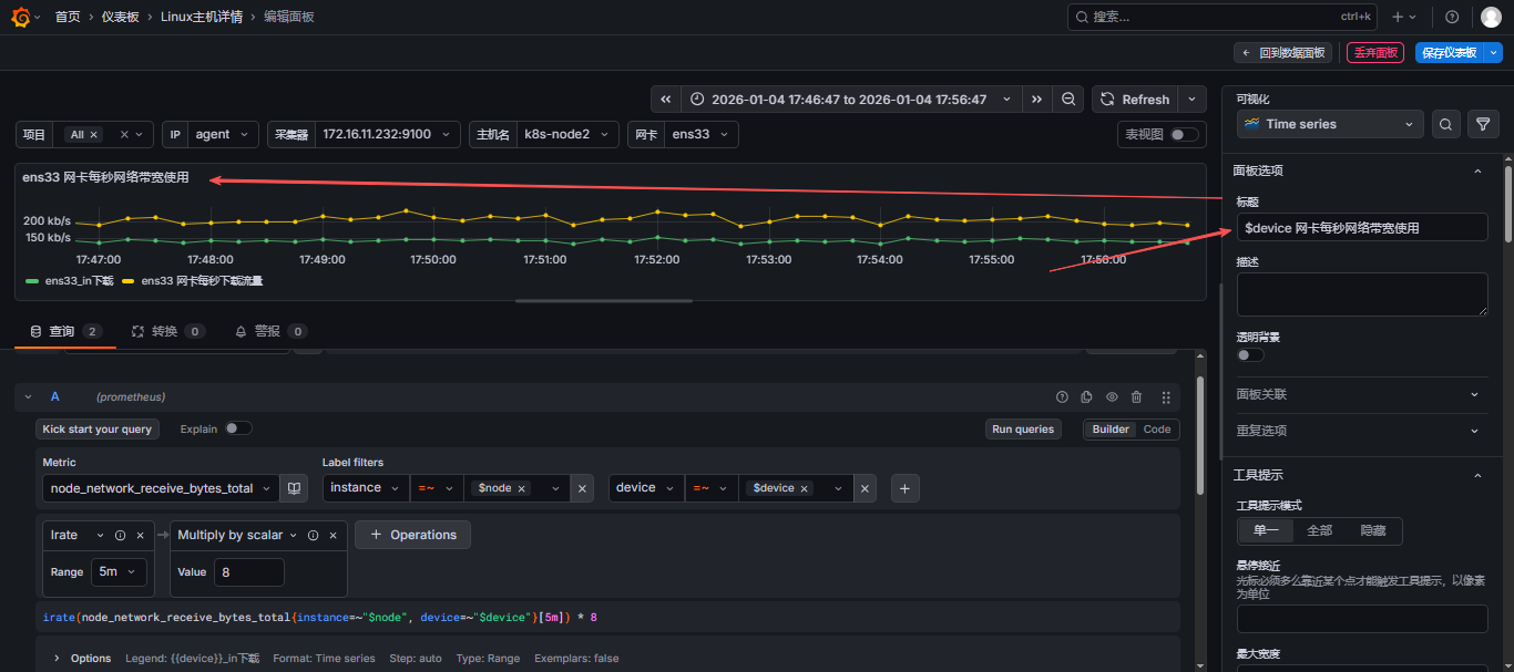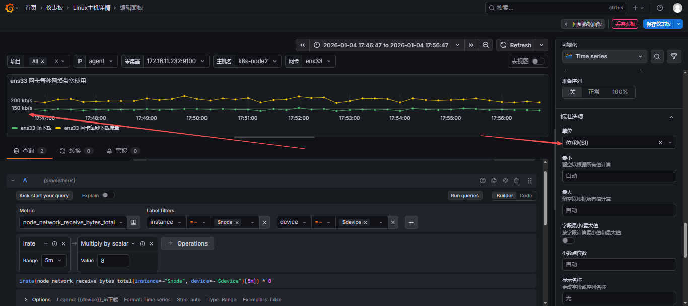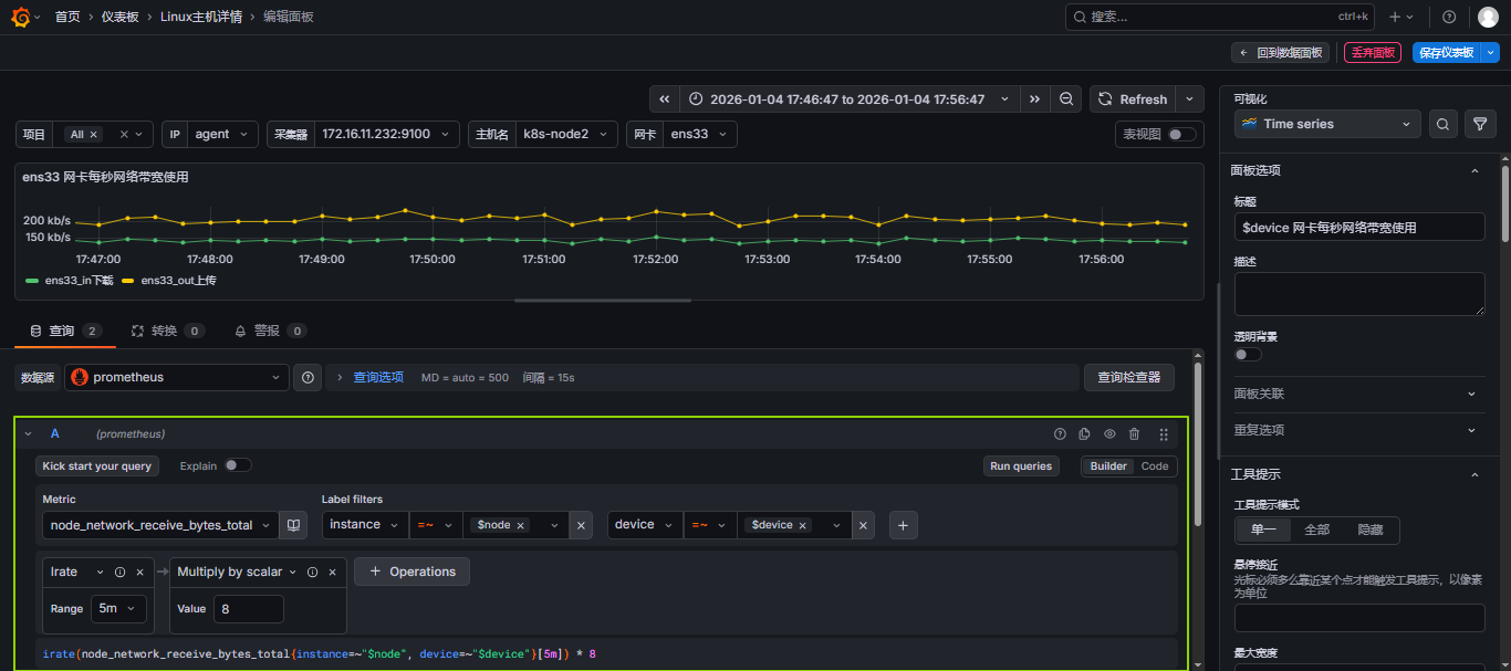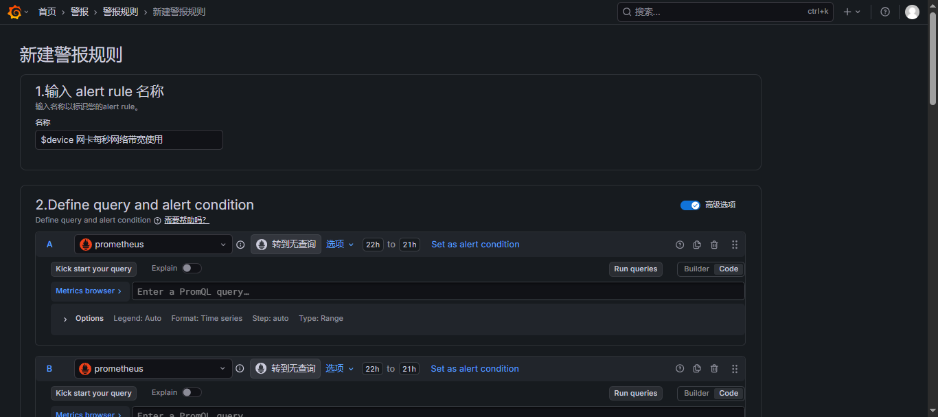 - 选择指标,可以同时添加多个指标,这里我就选择做网卡每秒网络带宽使用,那就需要添加上行和下行流量,可以参考此文:【云原生】Prometheus之PromQL用法详解 来写