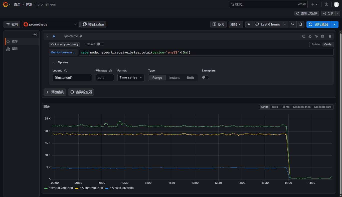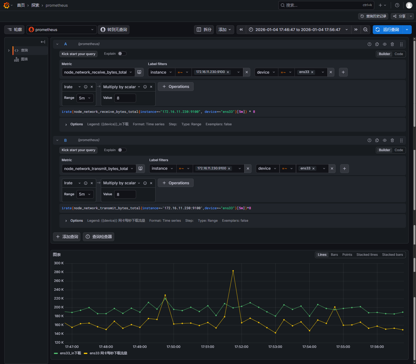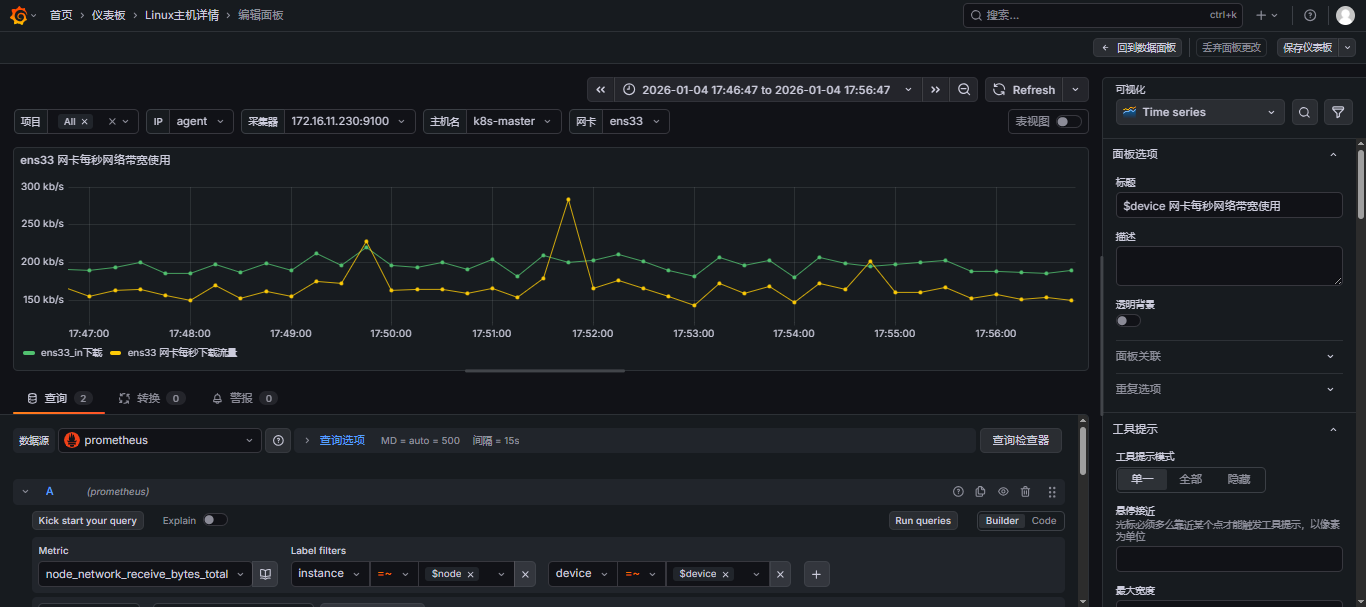 - 选择指标,可以同时添加多个指标,这里我就选择做网卡每秒网络带宽使用,那就需要添加上行和下行流量,可以参考此文:【云原生】Prometheus之PromQL用法详解 来写