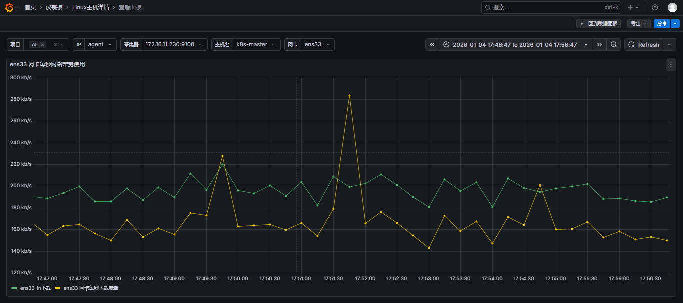 Refresh旁边的V ,选择自动刷新的时间; - 也可以自定义选择网卡信息,进行网卡流量监控;