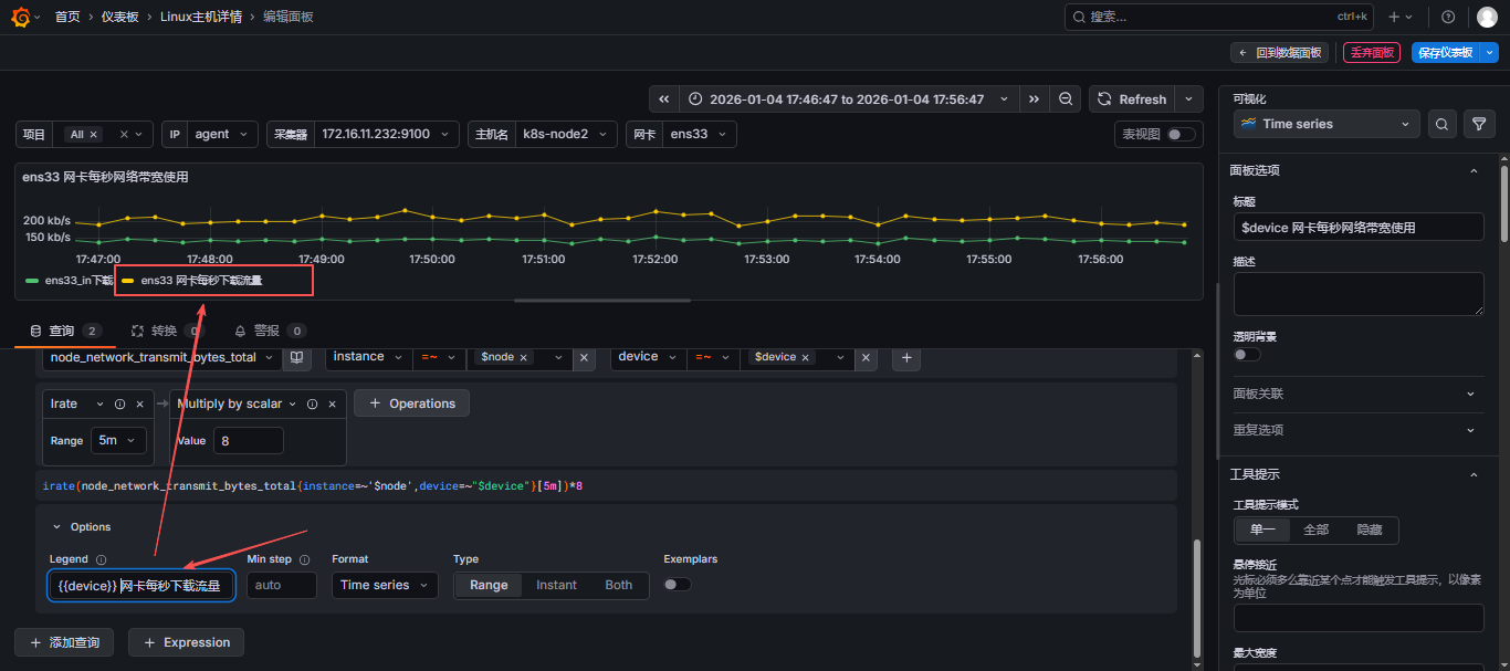 Options-Legend-Custom- 可以使用变量,变量使用{{device}}这样使用;例如,吧下面的名称改为哪个网卡的每秒下载流量;