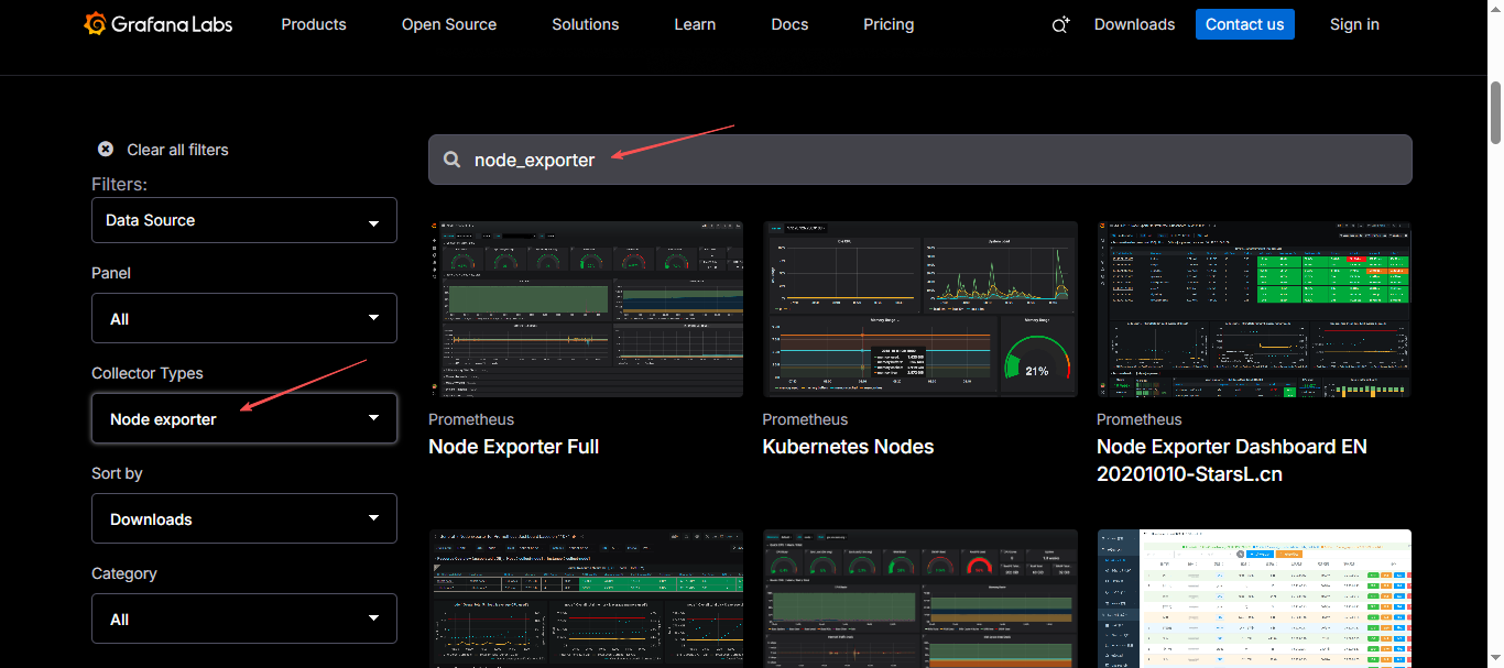 进入官网,往下拉,可以看到有很多模板,这里比如我们可以找node_exporter,可以直接搜索,也可也再Collector Types中选择Node exporter ,然后根据自己的需求选择模板;