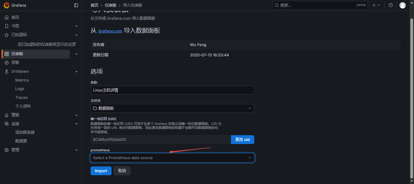 复制好id之后,打开在 Grafana 页面中,找到仪表板 --> 新建 --> 导入,选择自己导入的方式,输入 ID 号、网址或者上传 JSON 文件、输入JSON都可以,点击 加载;
