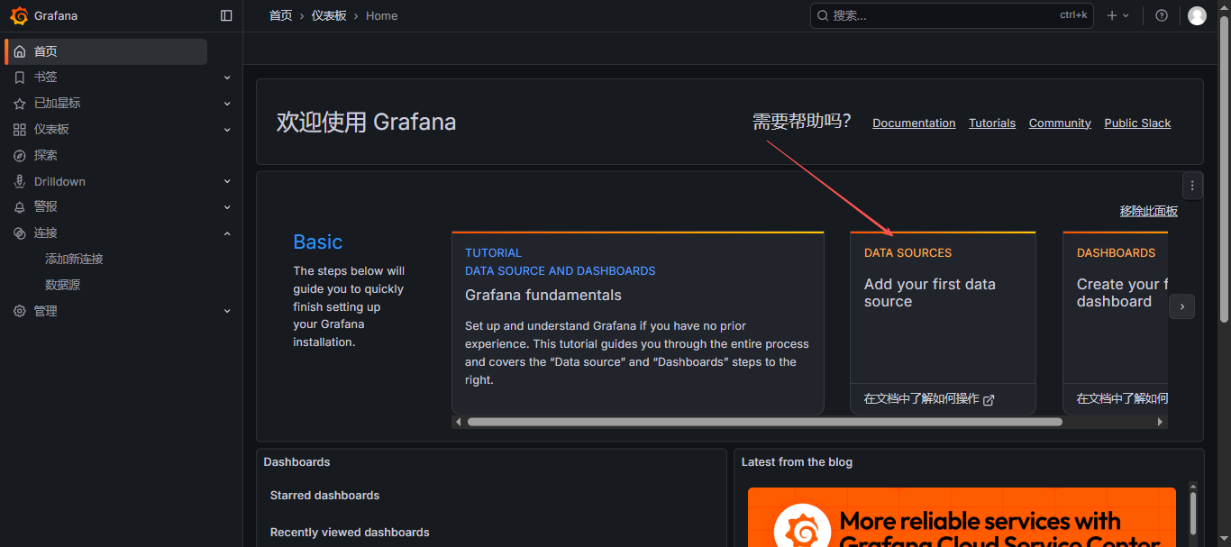 下面我们把 Prometheus 服务器收集的数据做为一个数据源添加到 grafana,让 grafana 可以得到 Prometheus 的数据。