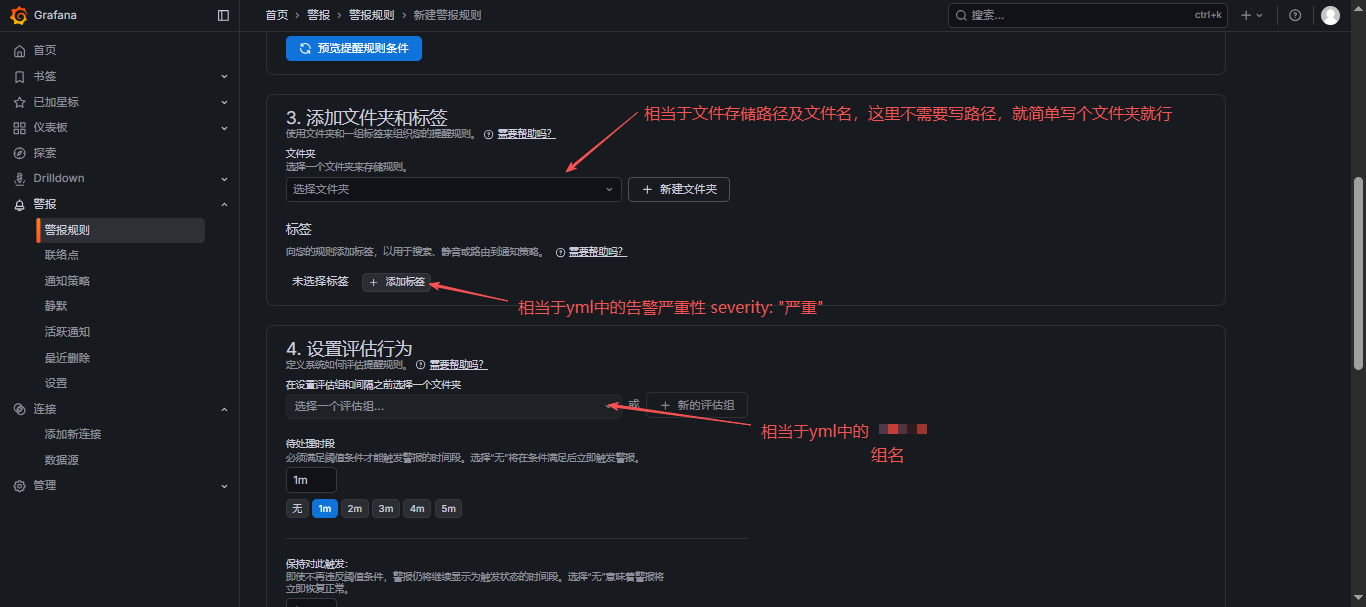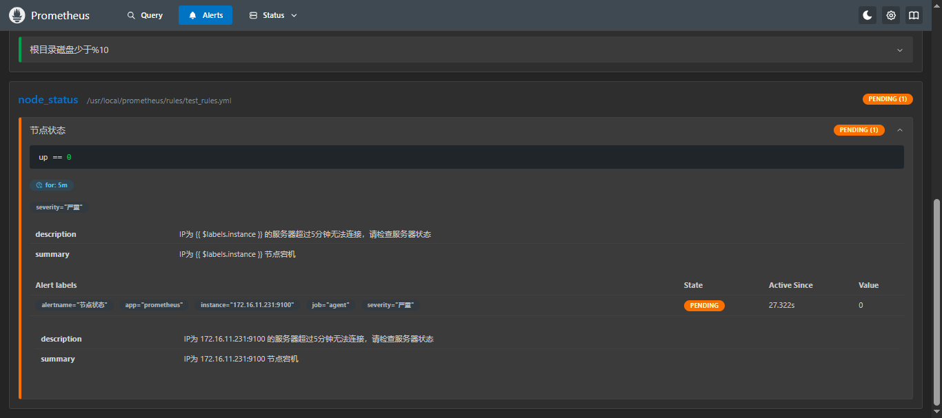 pending,超过30秒就进入firing状态 - 标签(labels),给告警打上标签,在使用时可以根据标签定位到指定告警