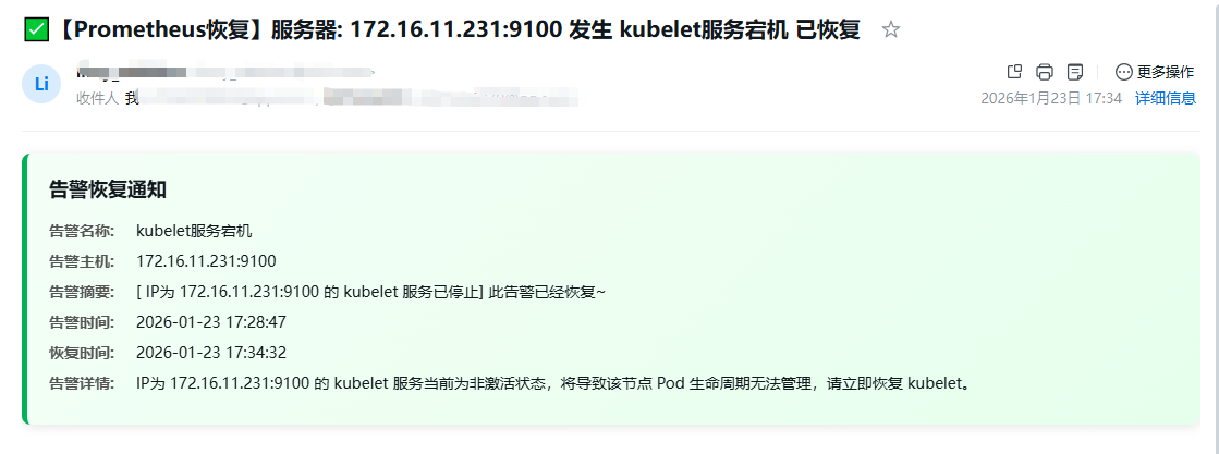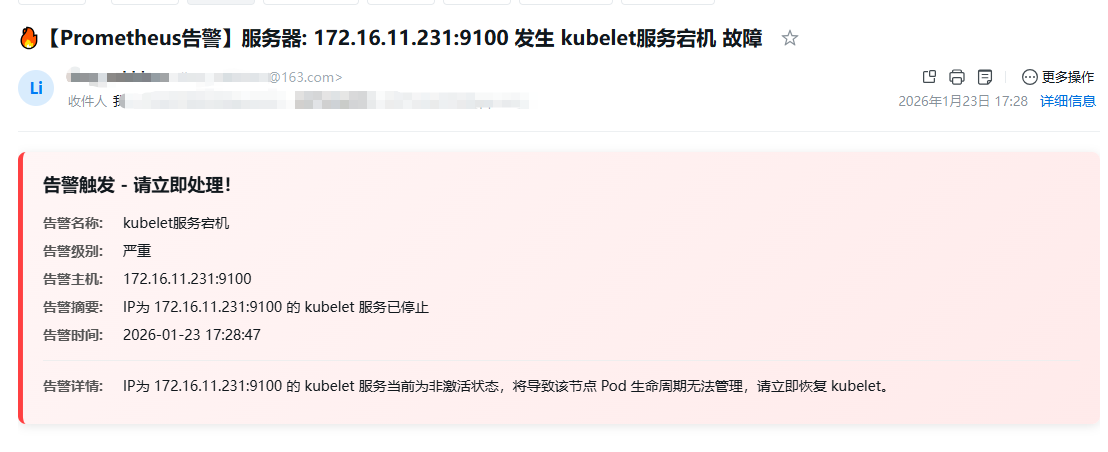 {{ define "email.html" }}:定义一个名为email.html的模板块,这个名称可以在 Alertmanager 的配置中引用。{{ .Labels.alertname }}:告警规则名称,同一类故障的标识。{{ .Labels.severity }}:从告警的Labels中获取severity标签,表示告警的严重性级别。{{ .Labels.instance }}:从告警的Labels中获取instance标签,通常表示故障主机的 IP 地址或主机名。{{ .Annotations.summary }}:从告警的Annotations中获取summary,通常是一个简短的告警概述。{{ (.StartsAt.Add 28800e9).Format "2006-01-02 15:04:05" }}:获取告警触发的时间戳.StartsAt,并将其转换为 UTC+8 时区(28800 秒 = 8 小时),然后格式化为指定的时间格式。{{ .Annotations.description }}:从告警的Annotations中获取description,通常是一个更详细的告警描述。{{ end }}:结束当前的模板块或循环。