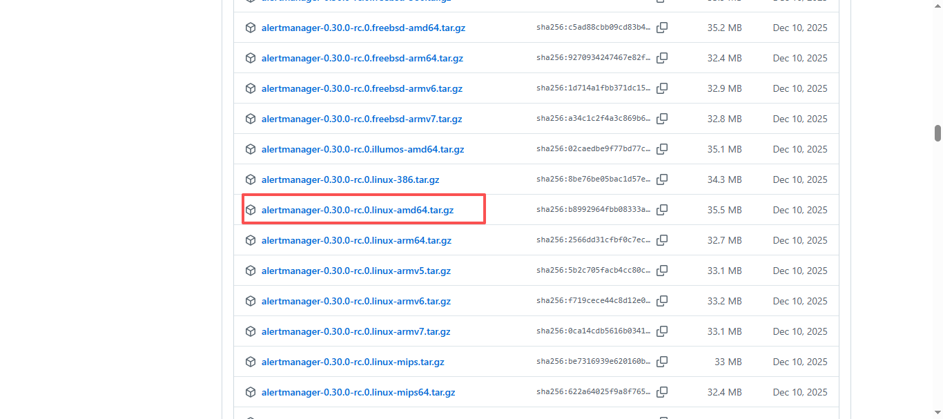 如果选择其他版本可以访问 Alertmanager安装包下载地址,按照自己所需版本及平台进行下载;