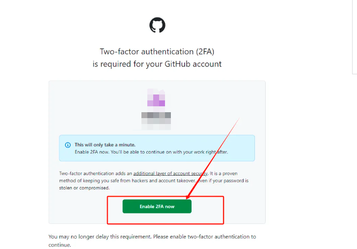 Two-factor authentication (2FA)is required for your GitHub account,这个是必须要弄的,如果你不开启,将在2025年4月好像就用不了,就会被限制登录。