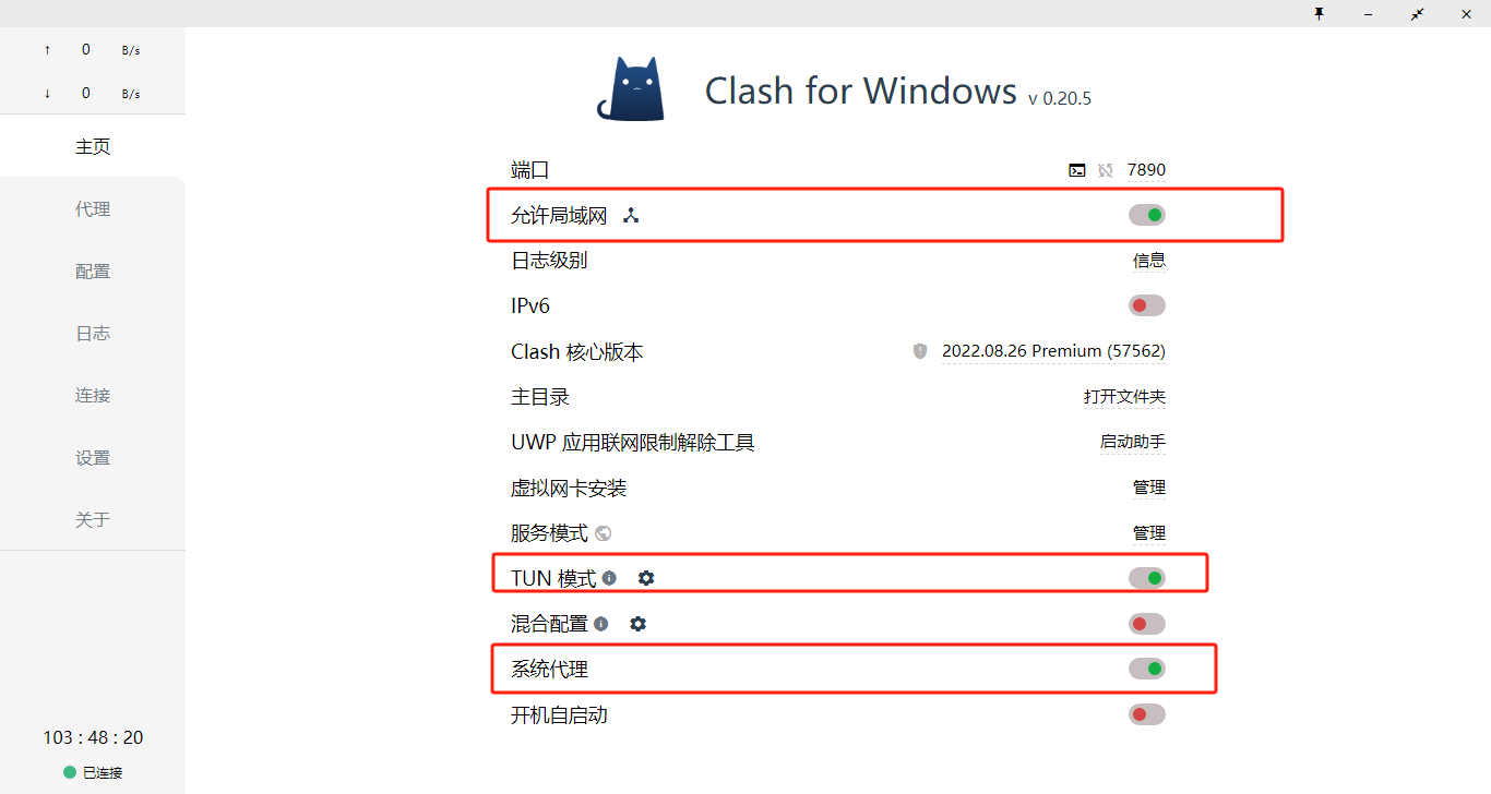 - 6.2 这里把Allow LAN(允许局域网)打开;然后把TUN MODE(TUN模式)打开,System Proxy(系统代理)打开;