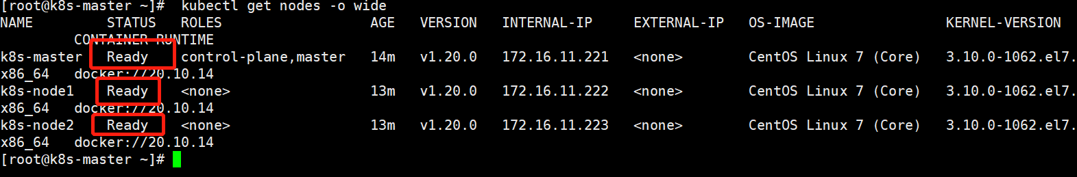 kubectl get nodes -o wideSTATUS 状态为Ready则连接成功。