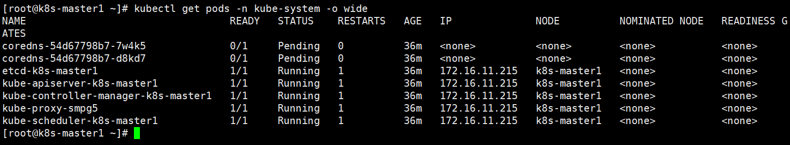 采用初始化安装方式,所有的系统组件均以容器的方式运行并且在kube-system命名空间内,此时可以查看Pod状态: