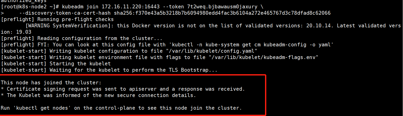 --discovery-token-ca-cert-hash sha256:f370e43a5b3218b7b6094980edd4fac3b6104a272e465767d3c78dfad8c62066[root@k8s-node2 ~]# kubeadm join 172.16.11.220:16443 --token 7t2weq.bjbawausm0jaxury \