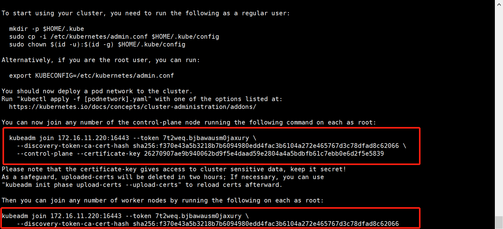 --control-plane --certificate-key 26270907ae9b940062bd9f5e4daad59e2804a4a5bdbfb61c7ebb0e6d2f5e5839[root@k8s-master3 ~]# kubeadm join 172.16.11.220:16443 --token 7t2weq.bjbawausm0jaxury \