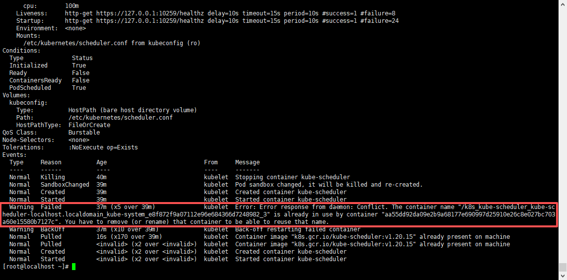 kubectl describe pod -n kube-system kube-scheduler-localhost.localdomain