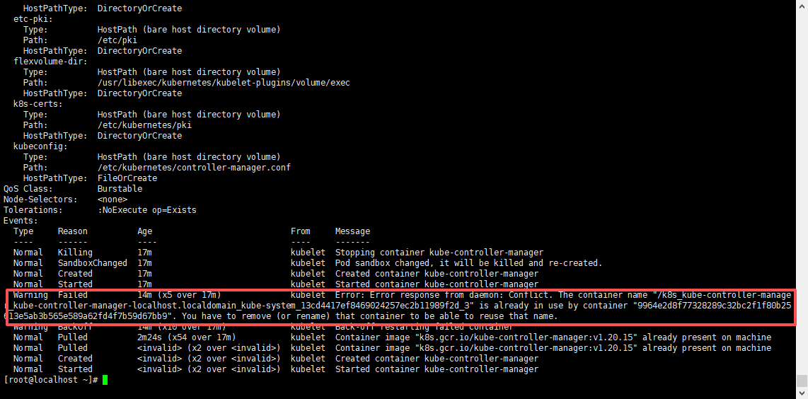 错误翻译是:kubelet错误:kubelet错误:来自守护进程的错误响应:冲突。容器名称“/k8s_kube-controller-manager _ kube-controller manager-rhost.localdomain_cube-system_13cd4417ef8469024257ec2b11989f2d_3”已被容器“9964e2d8f77328289c32bc2f1f80b25613e5ab3b565e589a62fd4f7b59d67bb9”使用。您必须删除(或重命名)该容器才能重用该名称。